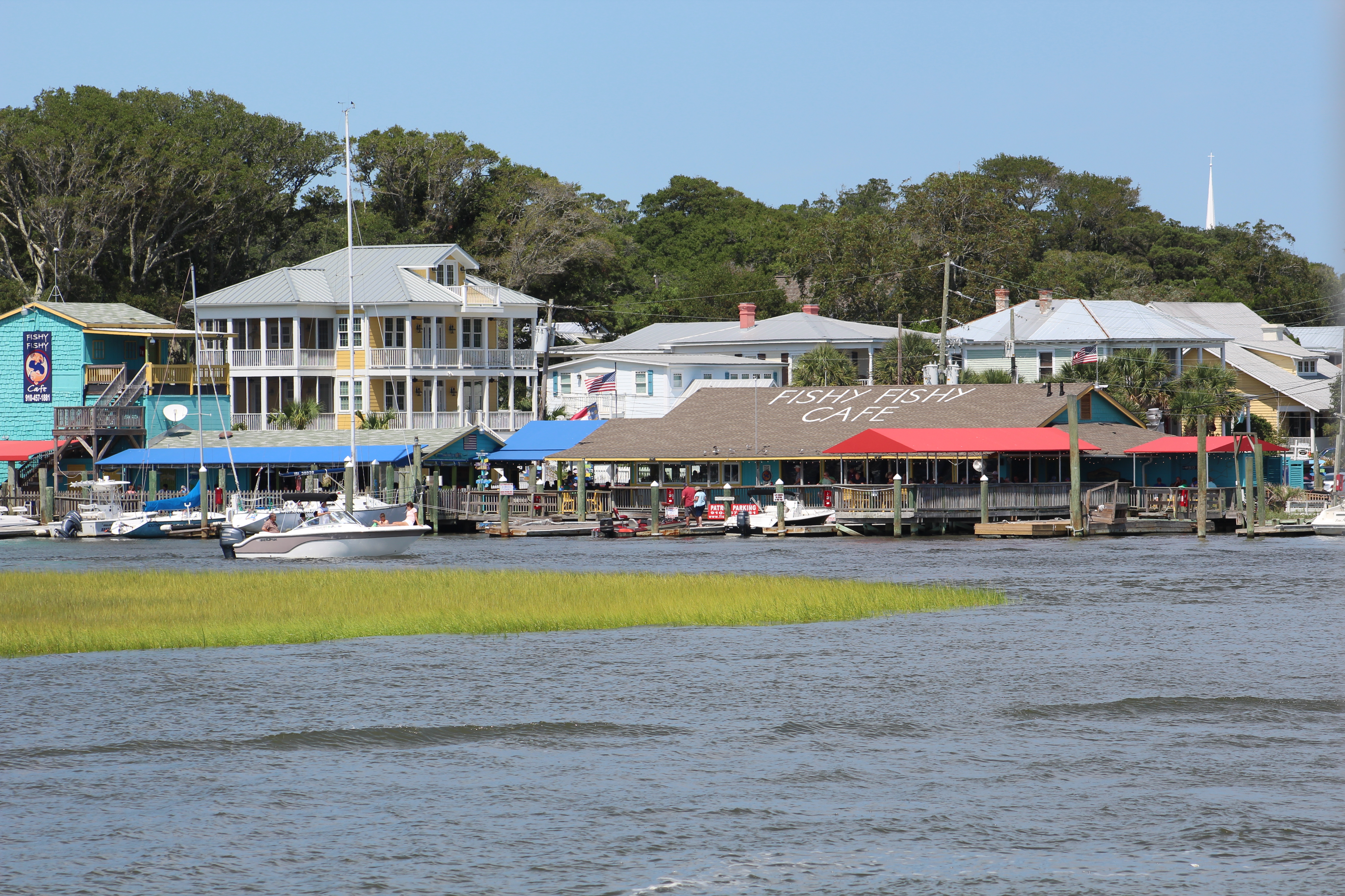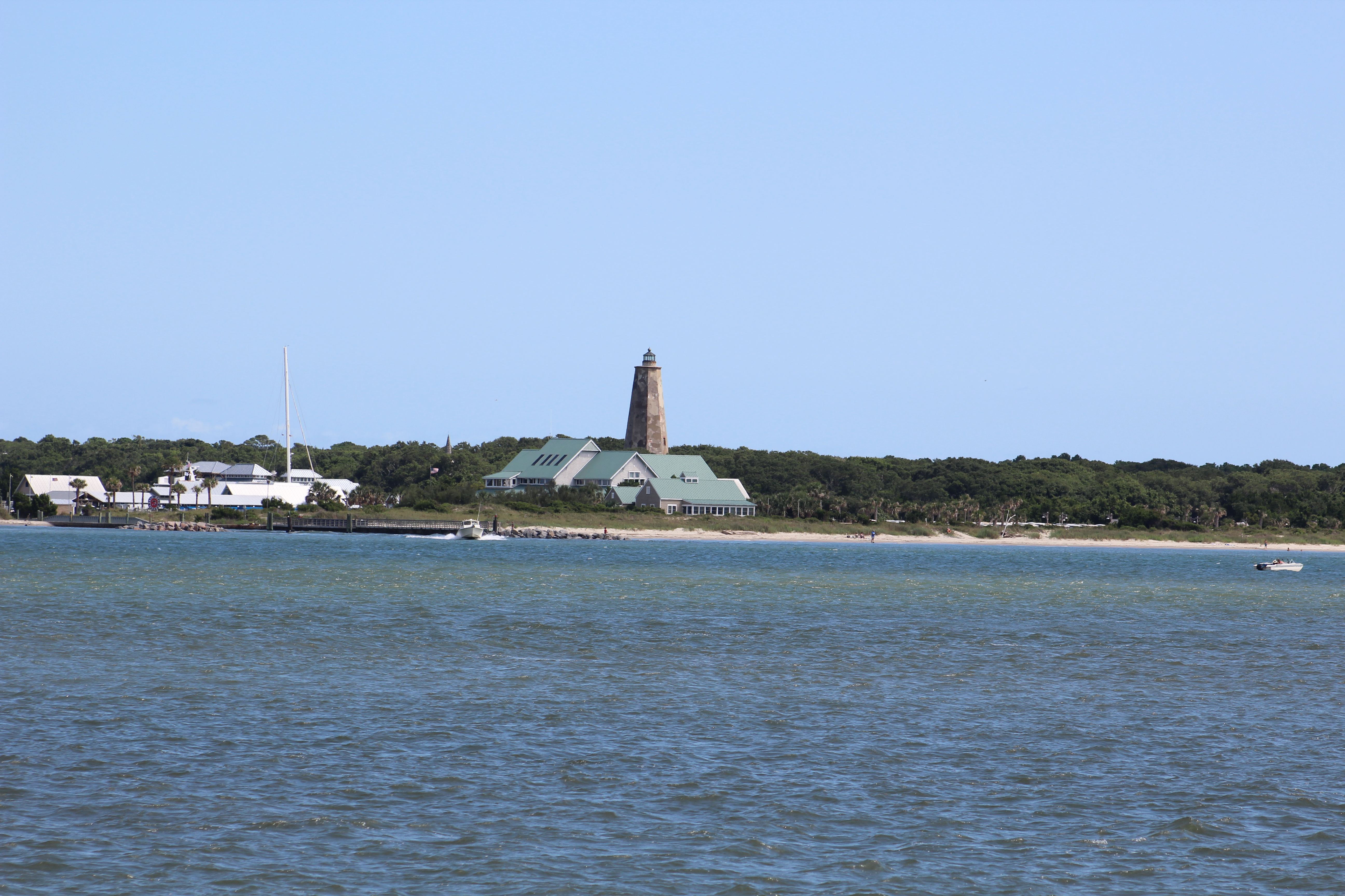 Rather than stay in Southport, the crew decided to venture off of the ICW and make the 2 mile side trip to Bald Head Island. The decision was rewarded with a nice evening of walking and exploring the sites, a surprise alligator in the marina, ice cream and fishing. The fishing was not as productive as hoped for, but lots of small fish were caught and two croaker were actually large enough to keep and fillet.