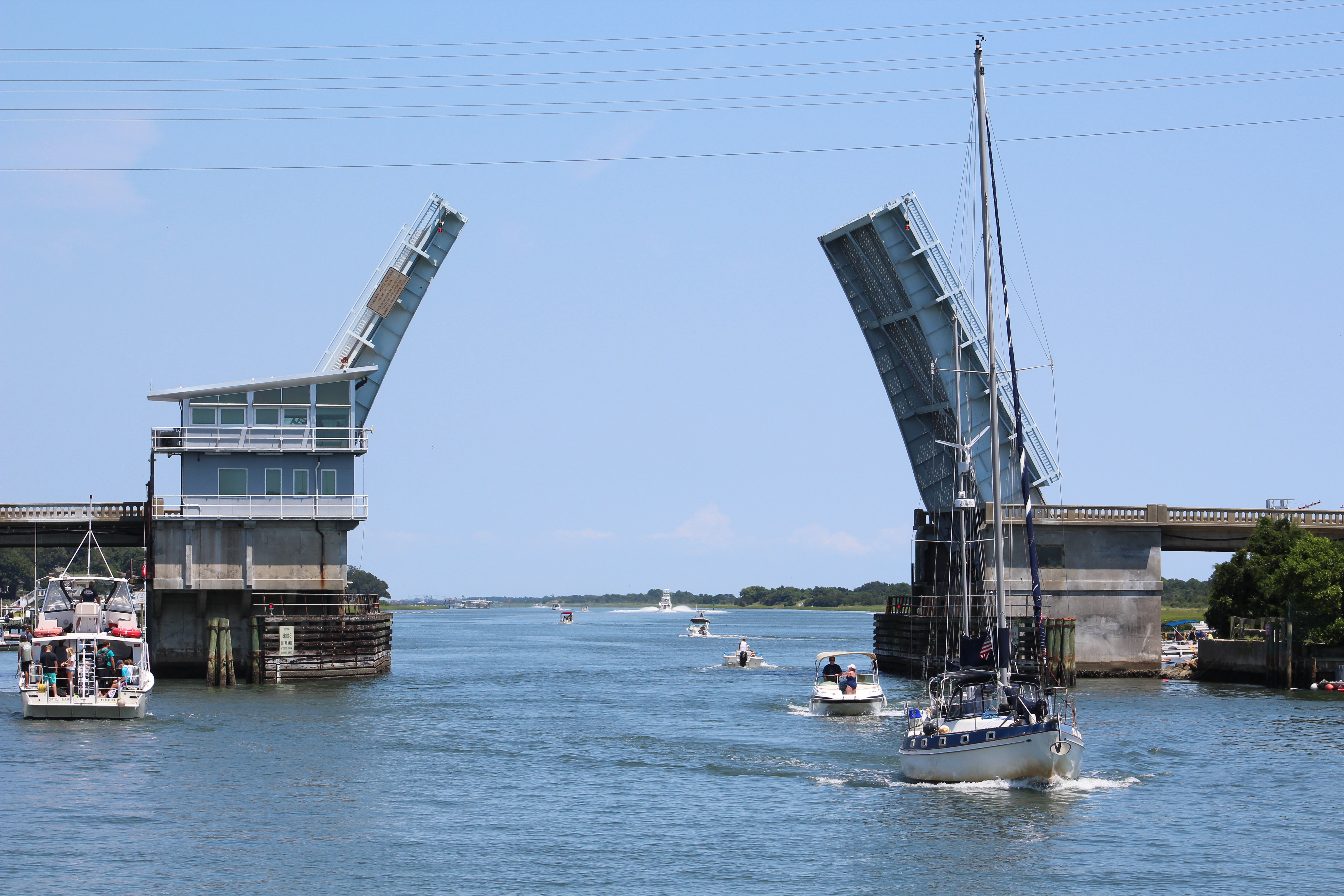 They were the second boat through for the 1400 bridge opening, but now needed to make the 8 miles to the Figure Eight Island Swing Bridge for its scheduled opening on the hour and half hour.