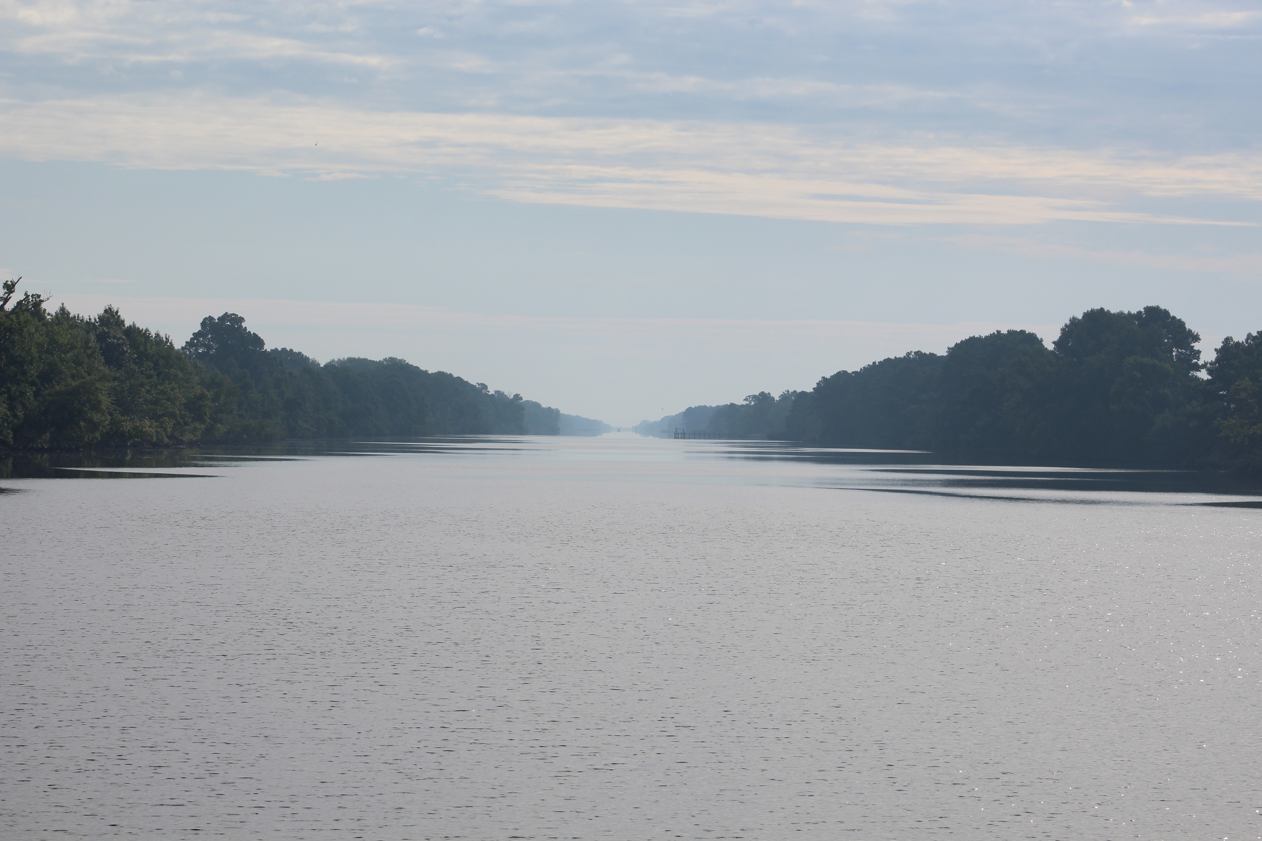 Five miles up Goose Creek dumped the crew into the Pamlico River. It was 5 miles wide and led to the Pungo River. It was 10 miles up the Pungo River when they reached Belhaven. The crew decided to travel another 10 miles up-river and anchor for the evening at the mouth of the Alligator River-Pungo River Canal.