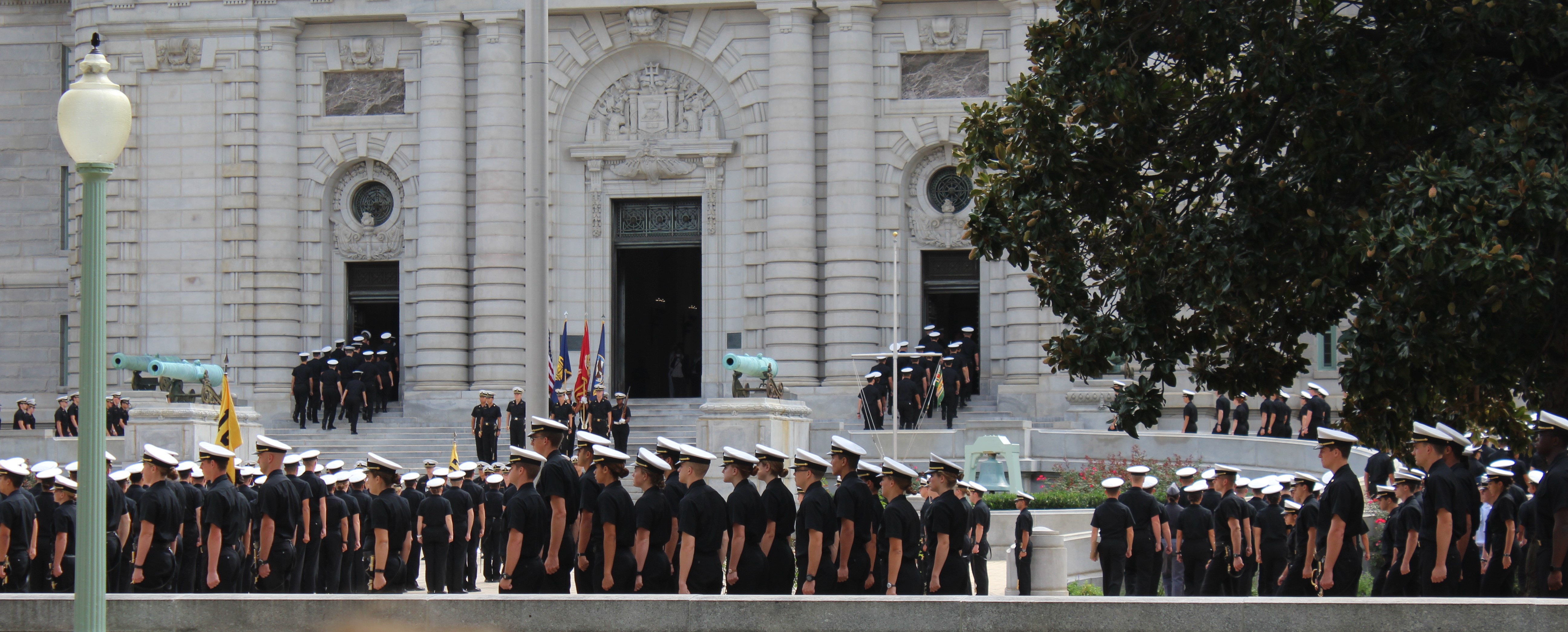 On Tuesday, the crew walked over and toured the Naval Academy and Visitor Center. The tour started at 1130, so the tour guide took them over to the dining hall where they watched 1400 midshipman fall into formation and then march into the hall to eat while the band played Anchors Aweigh.
