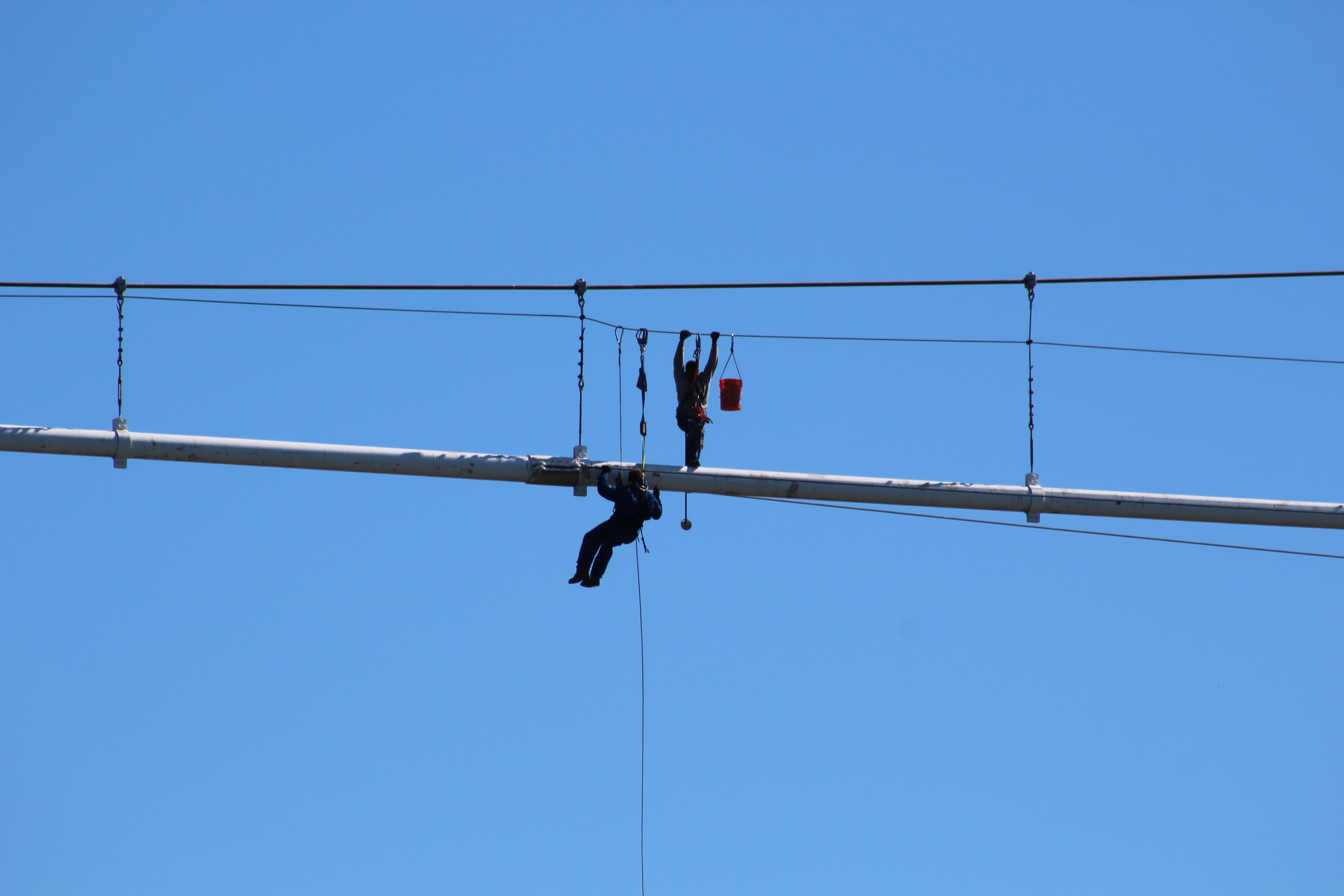 Since Still Waters II’s air clearance is 17 ft 6 in, they did not expect any issues transiting the 139 foot bridge clearance. However, when they saw two guys hanging on the pipeline the skipper decided to scoot over some and not take a chance on a dropped object accelerating and putting a hole in the boat.