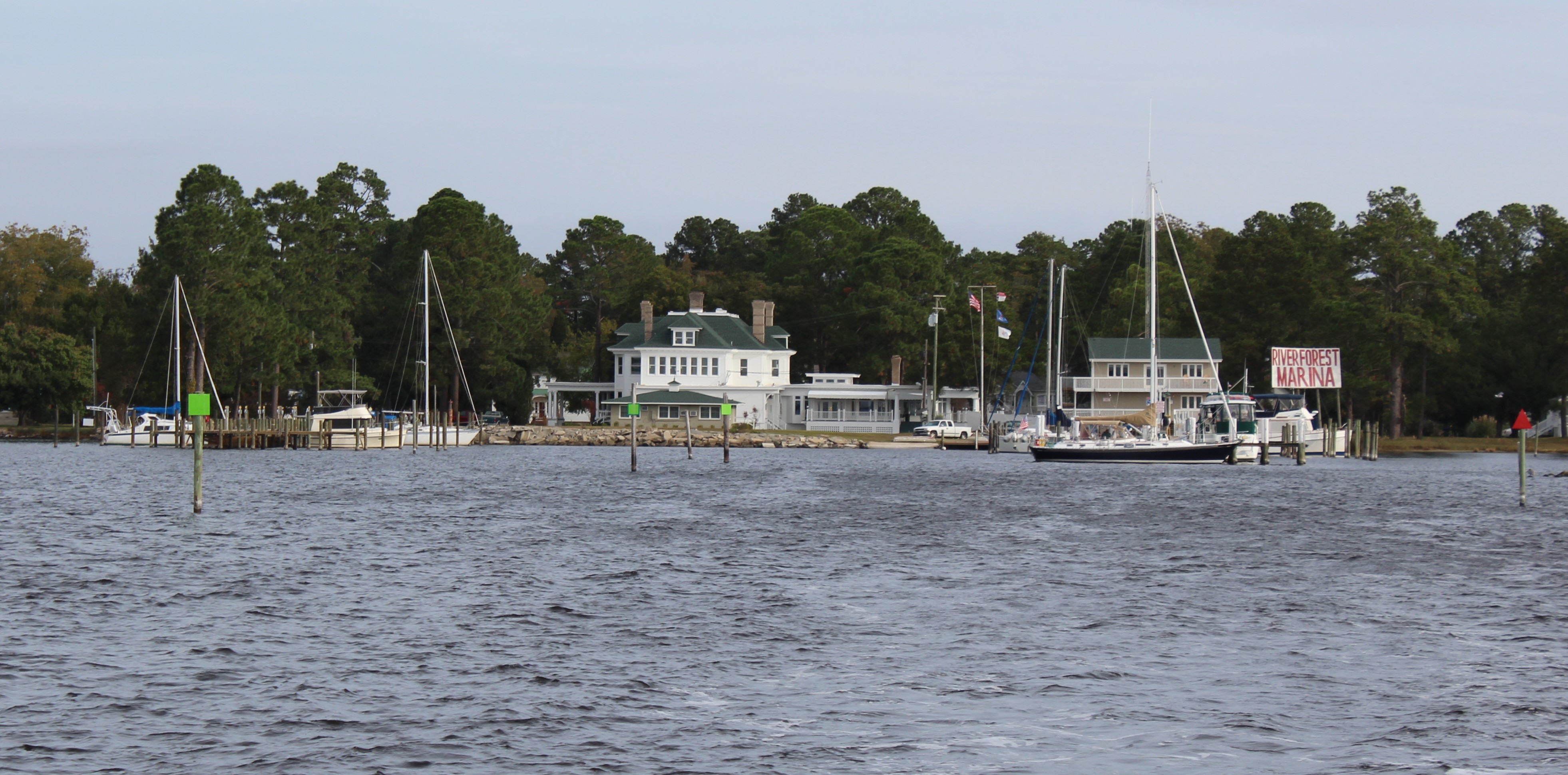 The crew weighed anchor and made 15 miles to the River Forest Manor and Marina in Belhaven, North Carolina, AKA “Beautiful Harbor.” The crew needed to provision and there was a grocery store about 1.5 miles from the marina. The marina offers courtesy golf carts and the crew used them to make the provisioning run to the store. New experience cruising through town on a golf cart.