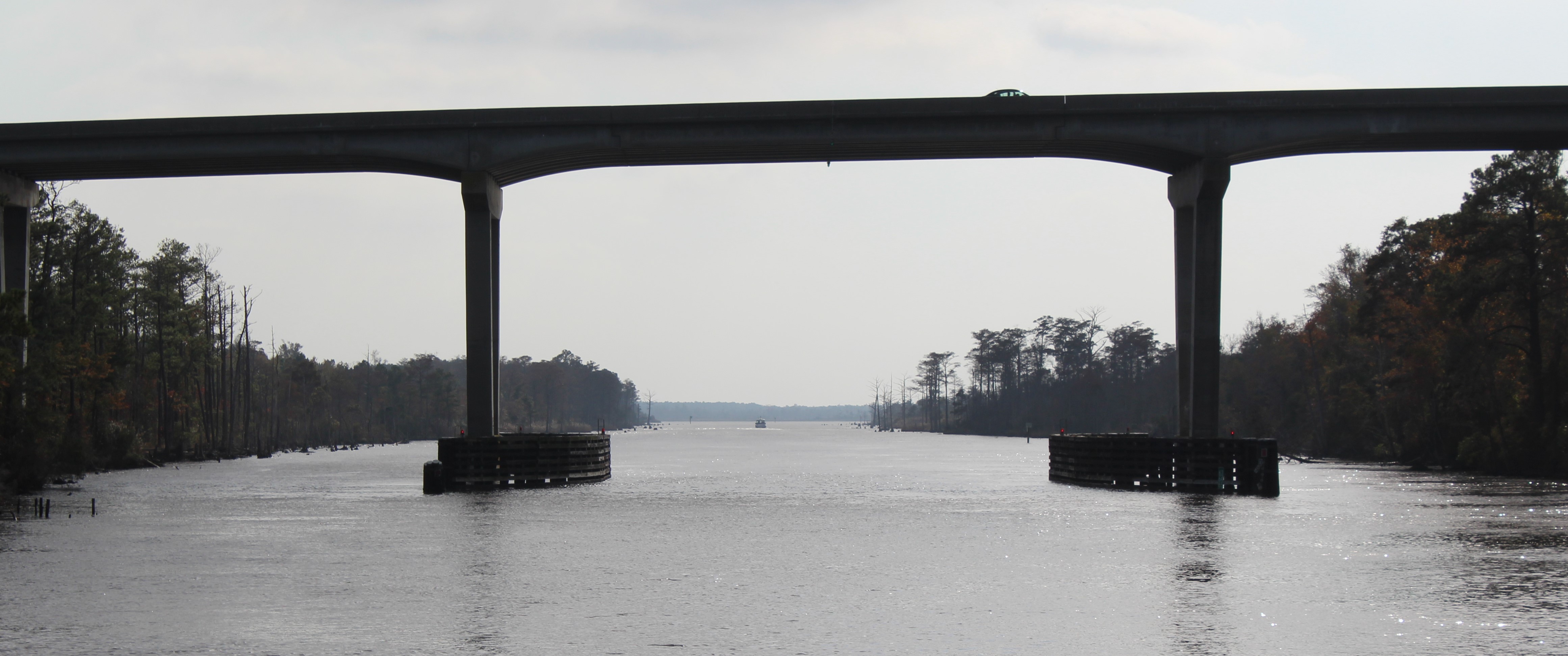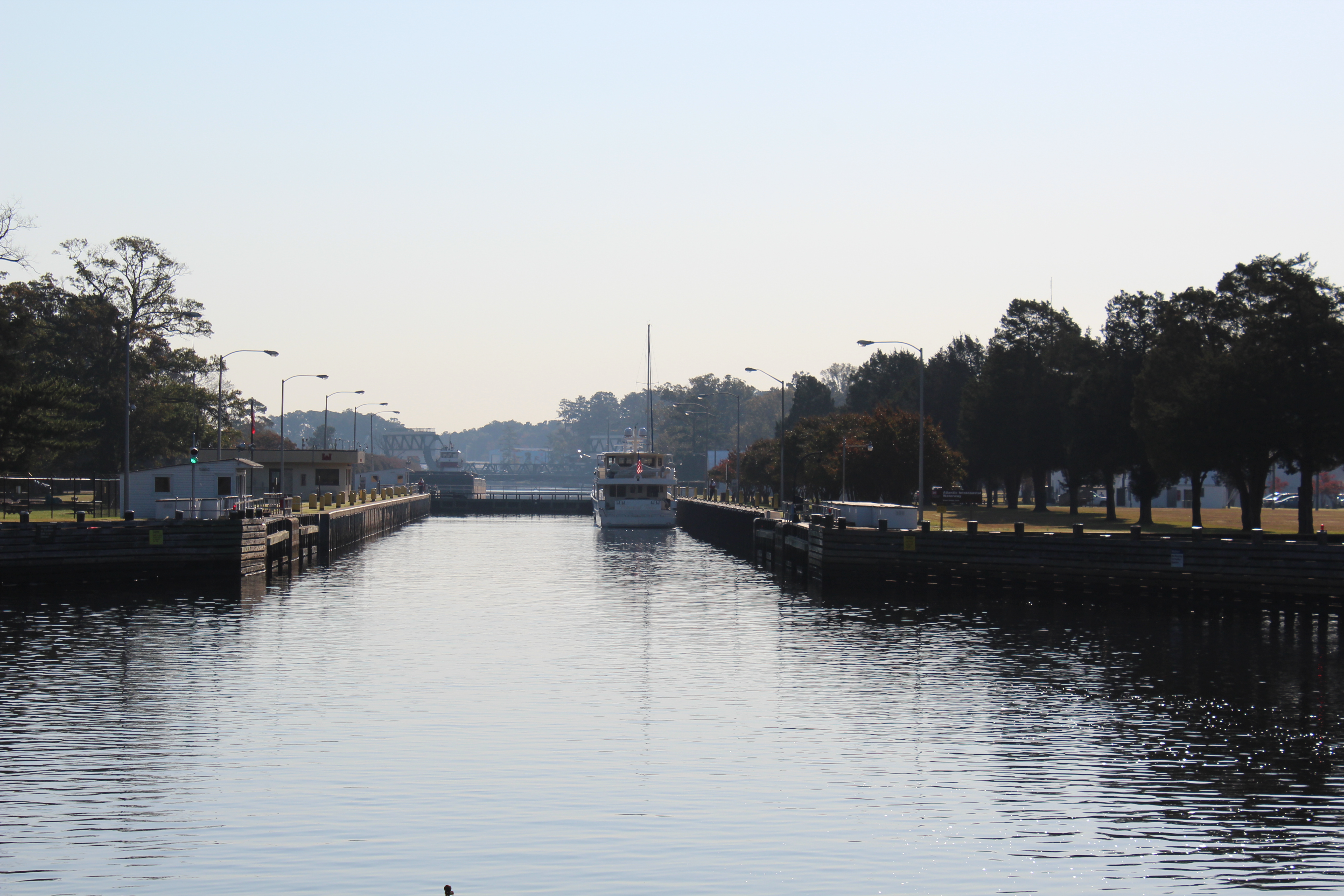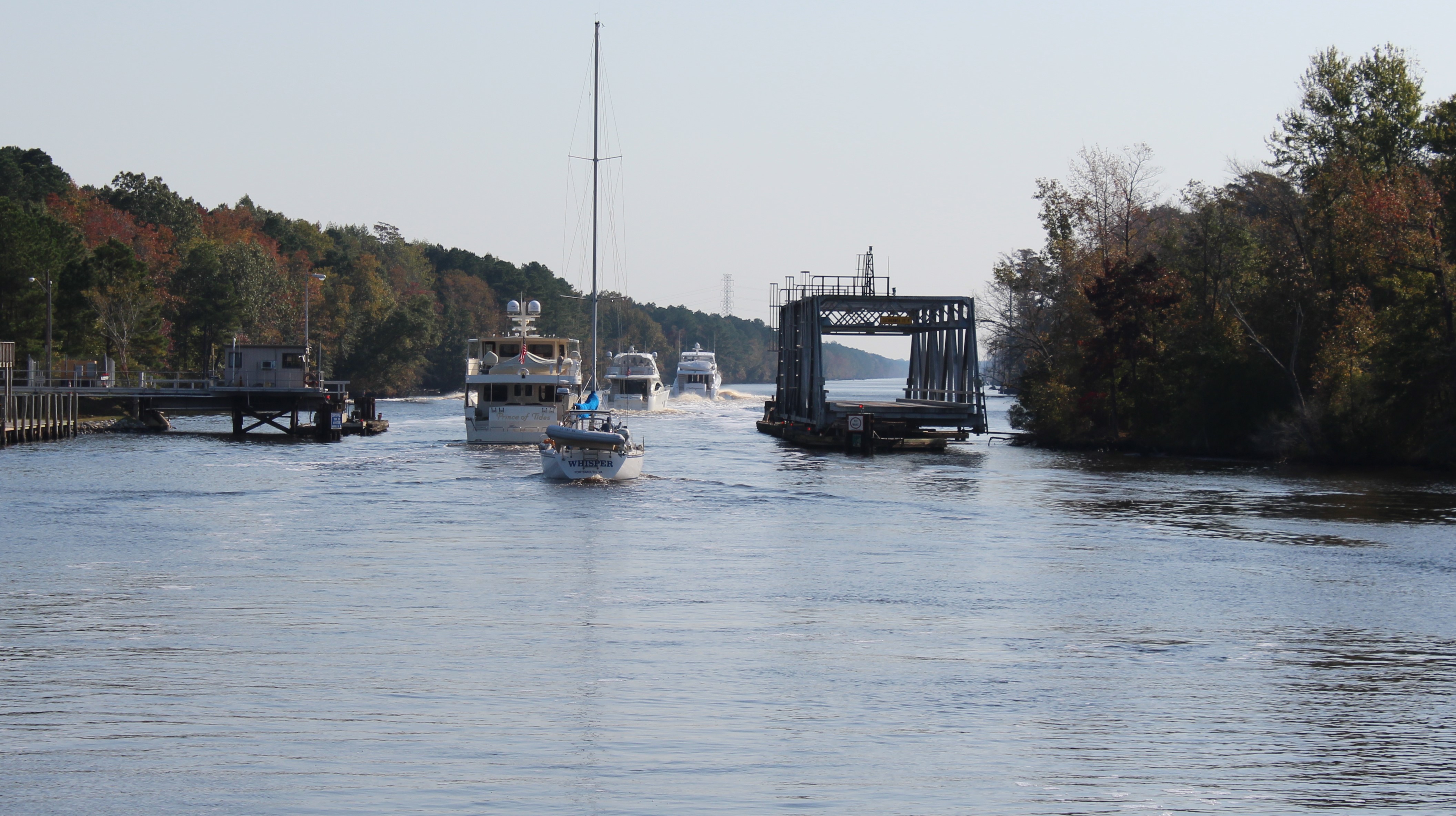 There are two routes south from Norfolk to cross the Albemarle Sound. The Dismal Swamp and the Virginia Cut. Since the crew took the Dismal Swamp route on the way north, they decided to try the Virginia Cut on the way south. The Virginia Cut has one lock to navigate and several bridges that are on set opening schedules. So the way takes some patience and coordinating.