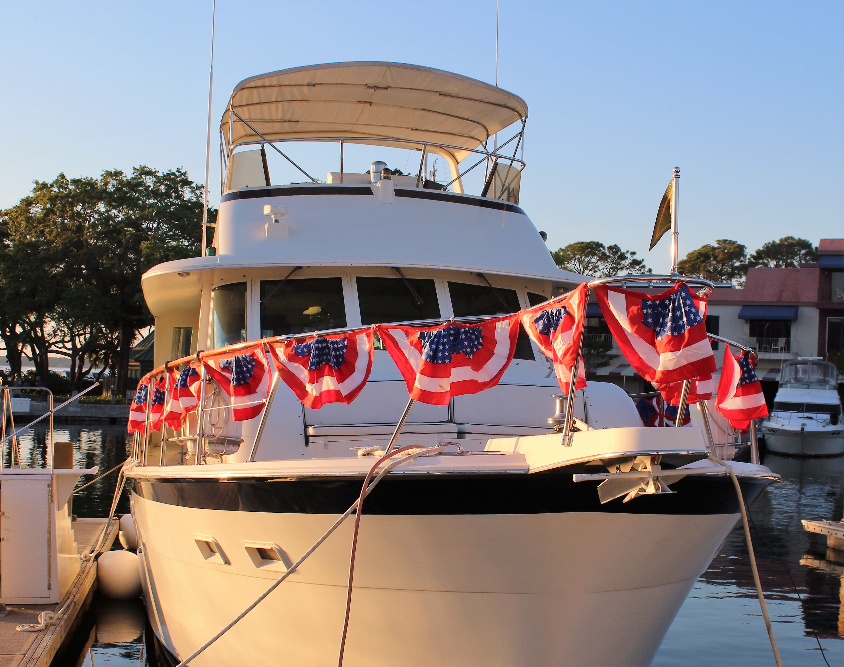 The gentleman who is docked behind Still Waters II has his boat all decked out with red, white, and blue bunting. He dressed up his boat for the golf tournament. He is 82 years old and lives onboard with his wife. The name of his boat is the ‘Ramblin’ Wreck.’ Yes, he is a 1957 graduate of Georgia Tech. The skipper enjoyed listening to his many stories.