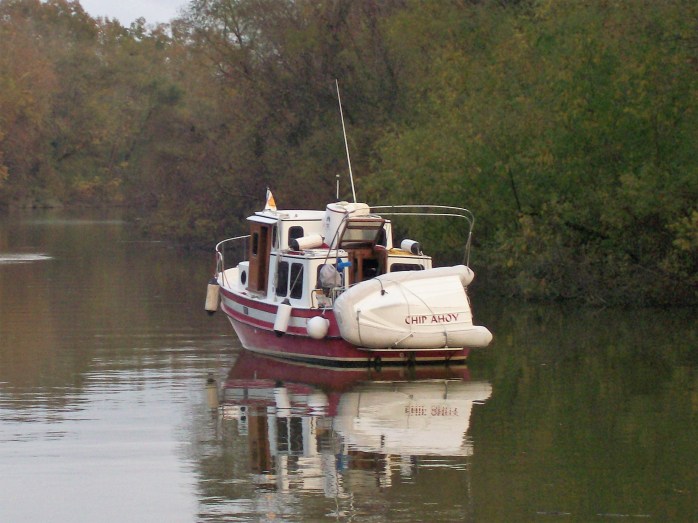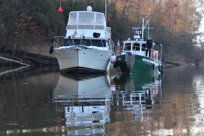Five miles later it was time to stop and find a place to drop the anchor near the boat ramp at Old Lock #2. The first spot the skipper picked did not work. The anchor set just fine but the wind direction was causing the boat to drift into the shore. The crew weighed anchor and moved to the other side of the river. The skipper found a good spot and the crew once again dropped the anchor. After getting the anchor set, Gammel Dansk came up on the port side and rafted up to Still Waters II.