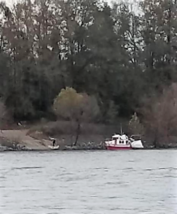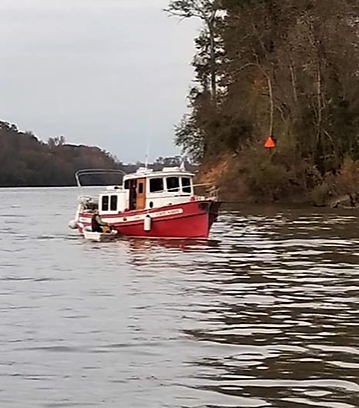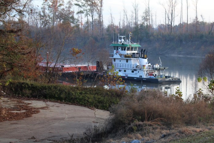 With the morning exercise program complete, the flotilla raised the anchors and headed downstream. As they began to move out into the channel Chip Ahoy noticed a tow around the bend headed upstream towards the boats. Everyone moved out of the way of the tow and made way south.