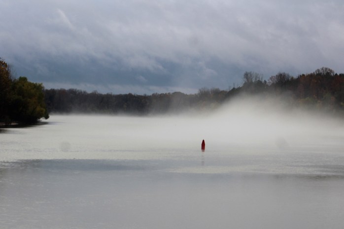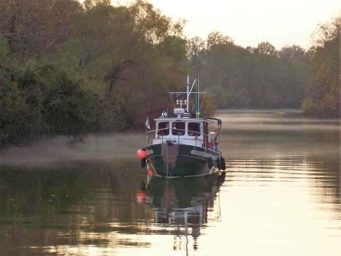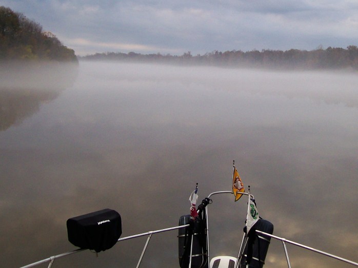 With a 70 mile day and a lock to go thru, the crew left Bobby’s bright and early. Well, maybe not so bright. It was 0600 in the morning with fog so it was anything but bright. It was pitch black.