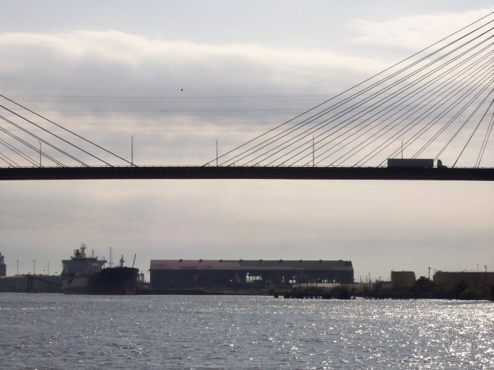Finally, in the distance, the Mobile skyline came into focus. Then the crew passed under the Cochrane Bridge and entered the Mobile Big Ship Channel. Being a Sunday, most of the waterfront businesses were closed and there was only one tow plowing the water downtown.