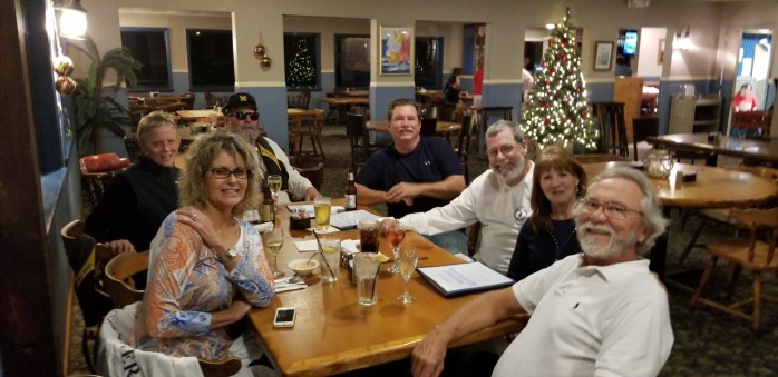 After arriving at Dog River Marina, taking on fuel, and getting docked the day was about spent. There was a restaurant across the water that was open, so the group boarded Chip Ahoy, and Bill taxied everyone over to the Mariners Restaurant. Upon arrival they discovered that Steve and Jane of Sabbatical were dining here also. The two tables combined and enjoyed a fine meal celebrating the completion of the inland rivers portion of the Great Loop.