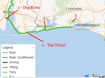 This past week the crew started their eastward journey along the Gulf Coast. As often happens on The Loop, they were thwarted by the weather. They did manage three travel days and a 0.3 mile jump to find safe haven from the storm scheduled to arrive Saturday afternoon. The Crew Left Dog River (1) and arrived on the Gulf Coast to dock at The Wharf (2) Monday. Stopped at Pensacola (3) to visit the Navy Aviation Museum on Thursday. Ended up at Ft Walton Beach (4) on Friday.