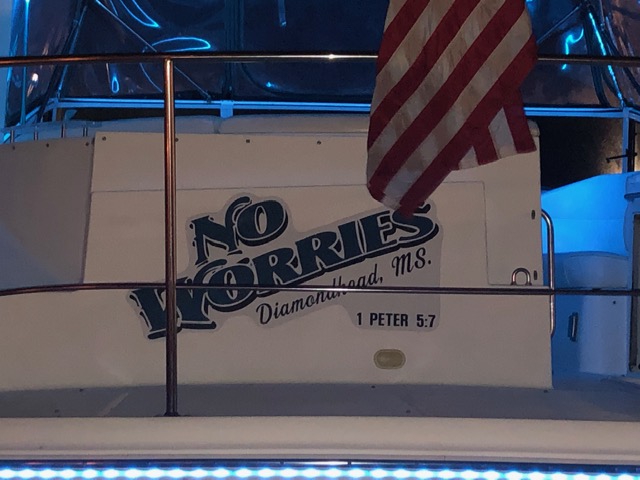 Notice the back of their boat has the following scripture reference: I Peter 5:7 (ESV)