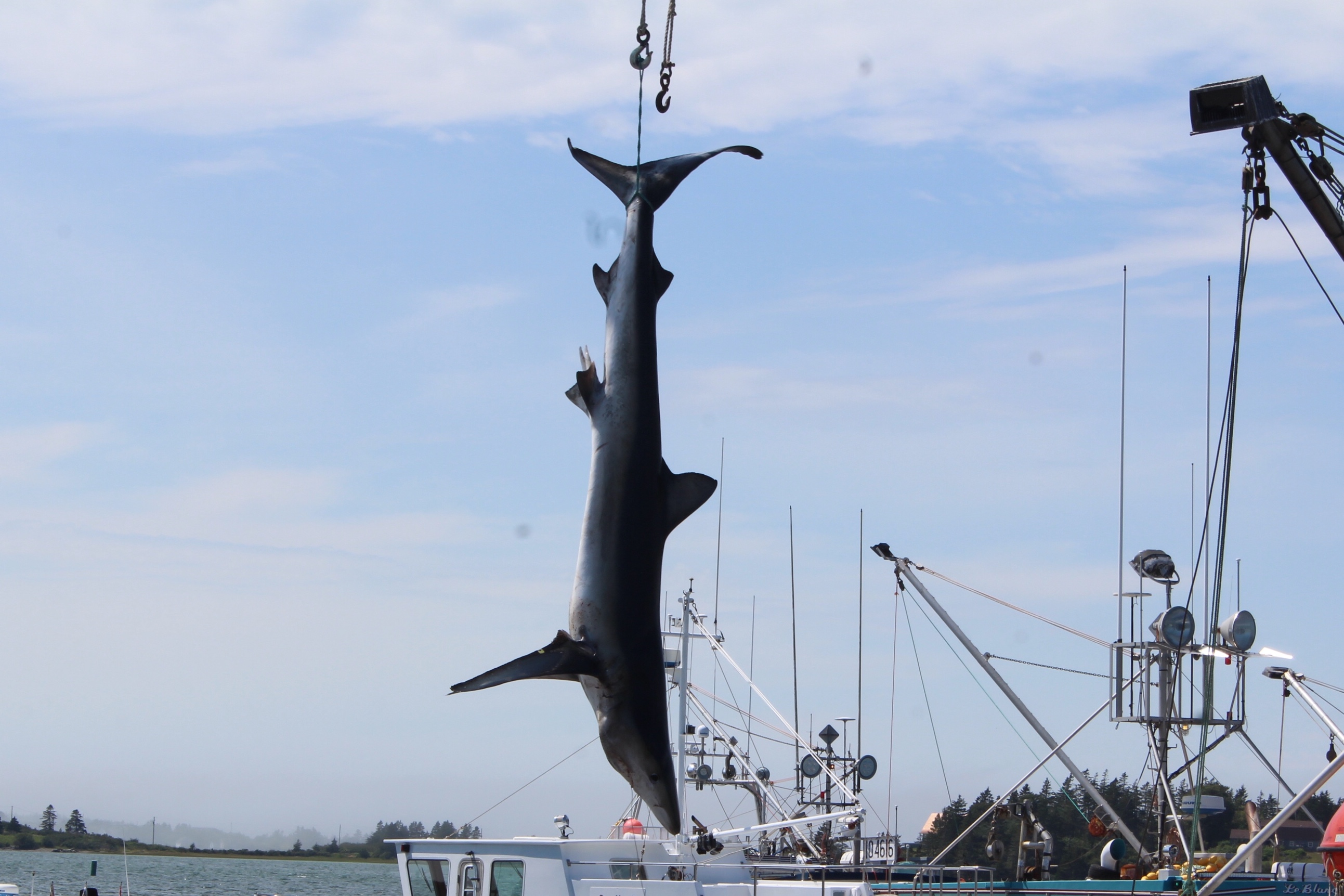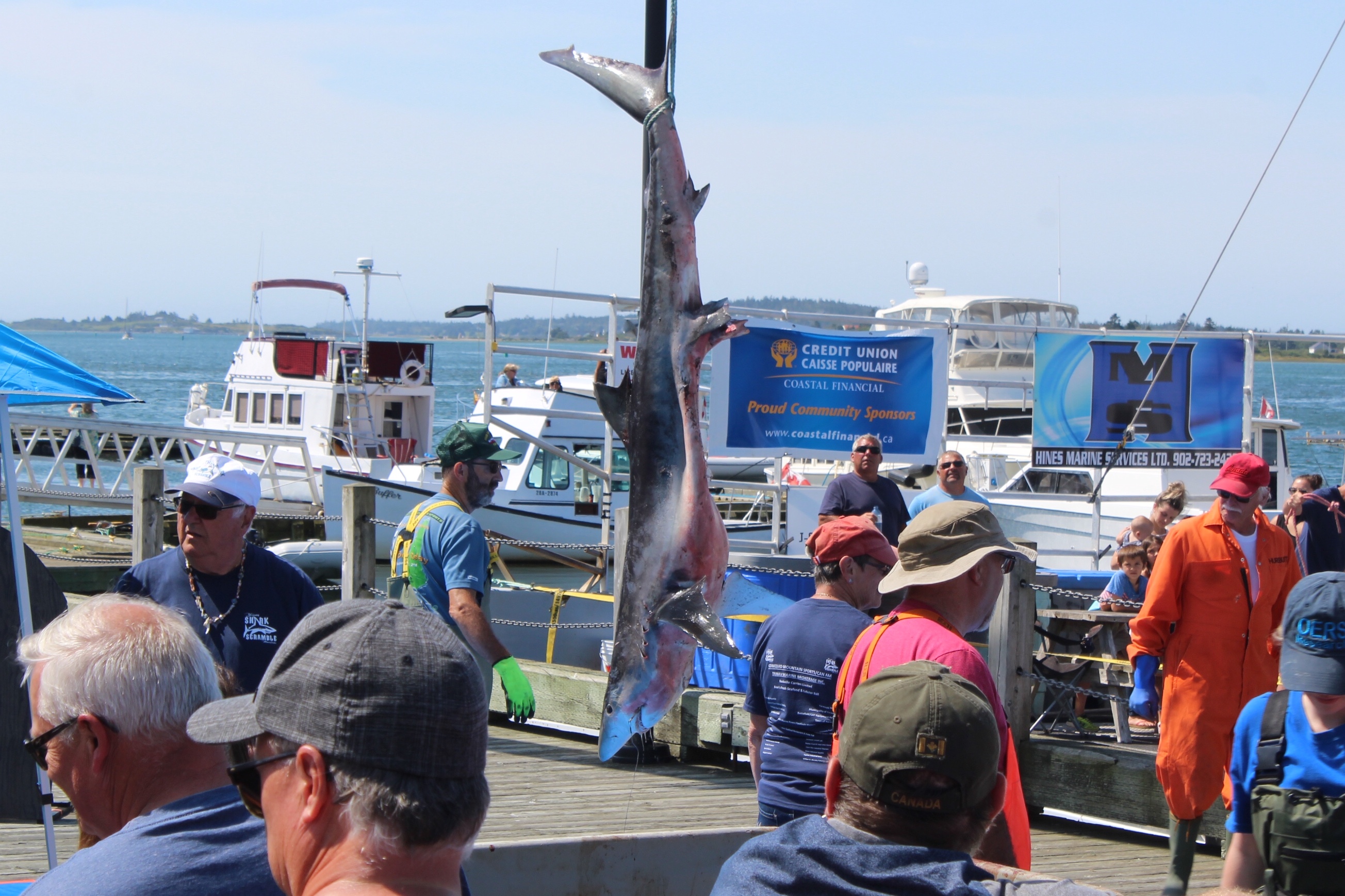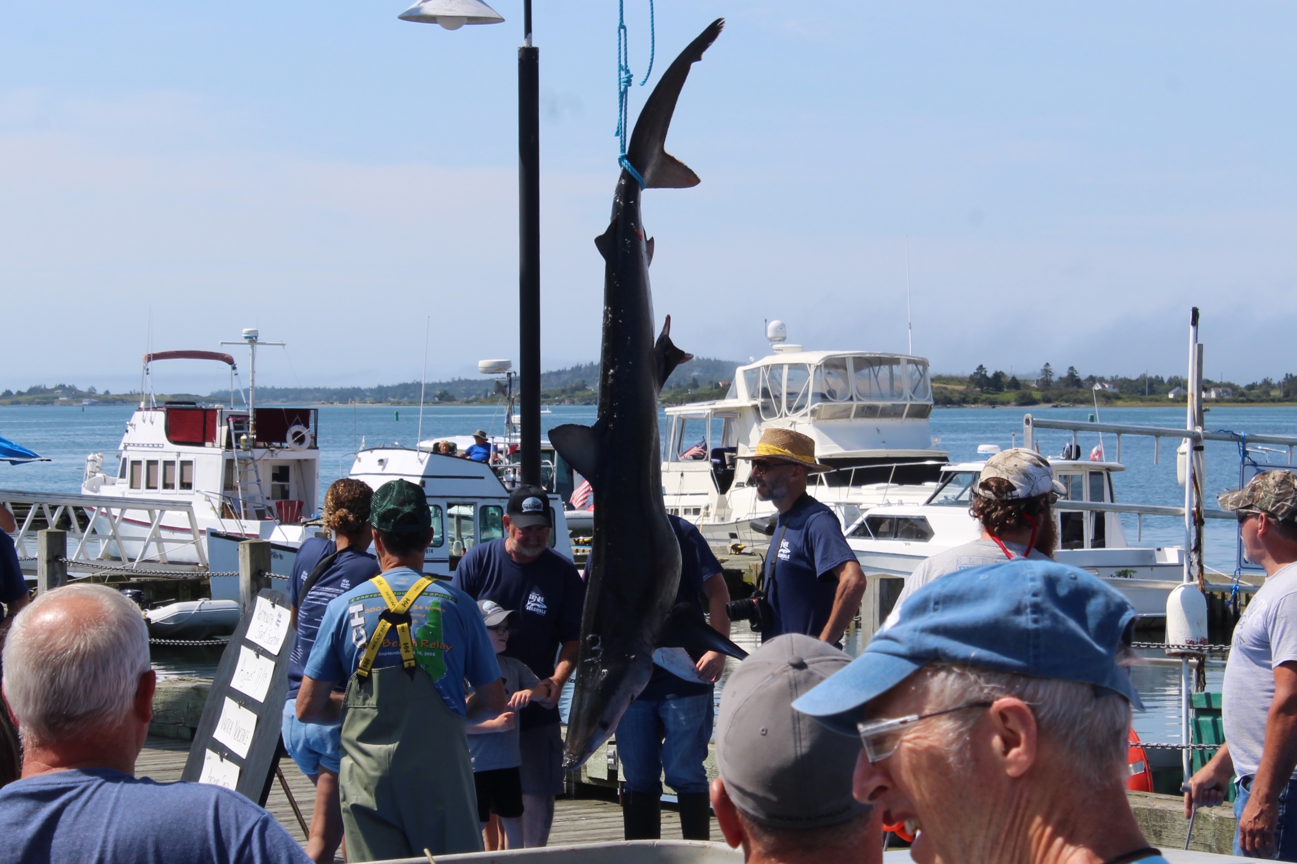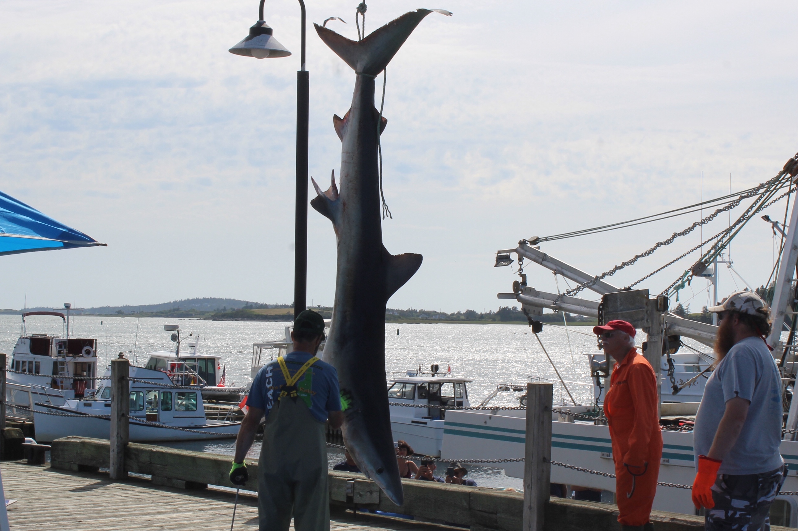At noon it was time to drift over to the next wharf and watch the weigh in for the Yarmouth Shark Scramble. This was the 21st Blue Shark Tournament. There were 15 boats registered who had 5-7 people onboard who were fishing for shark. Each boat could weigh in three sharks.