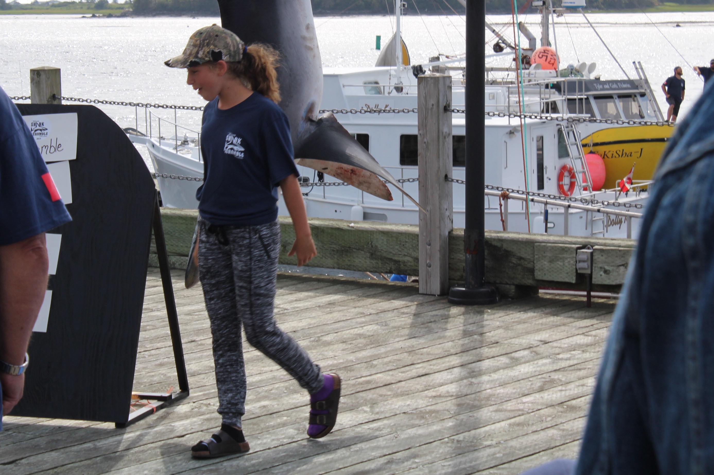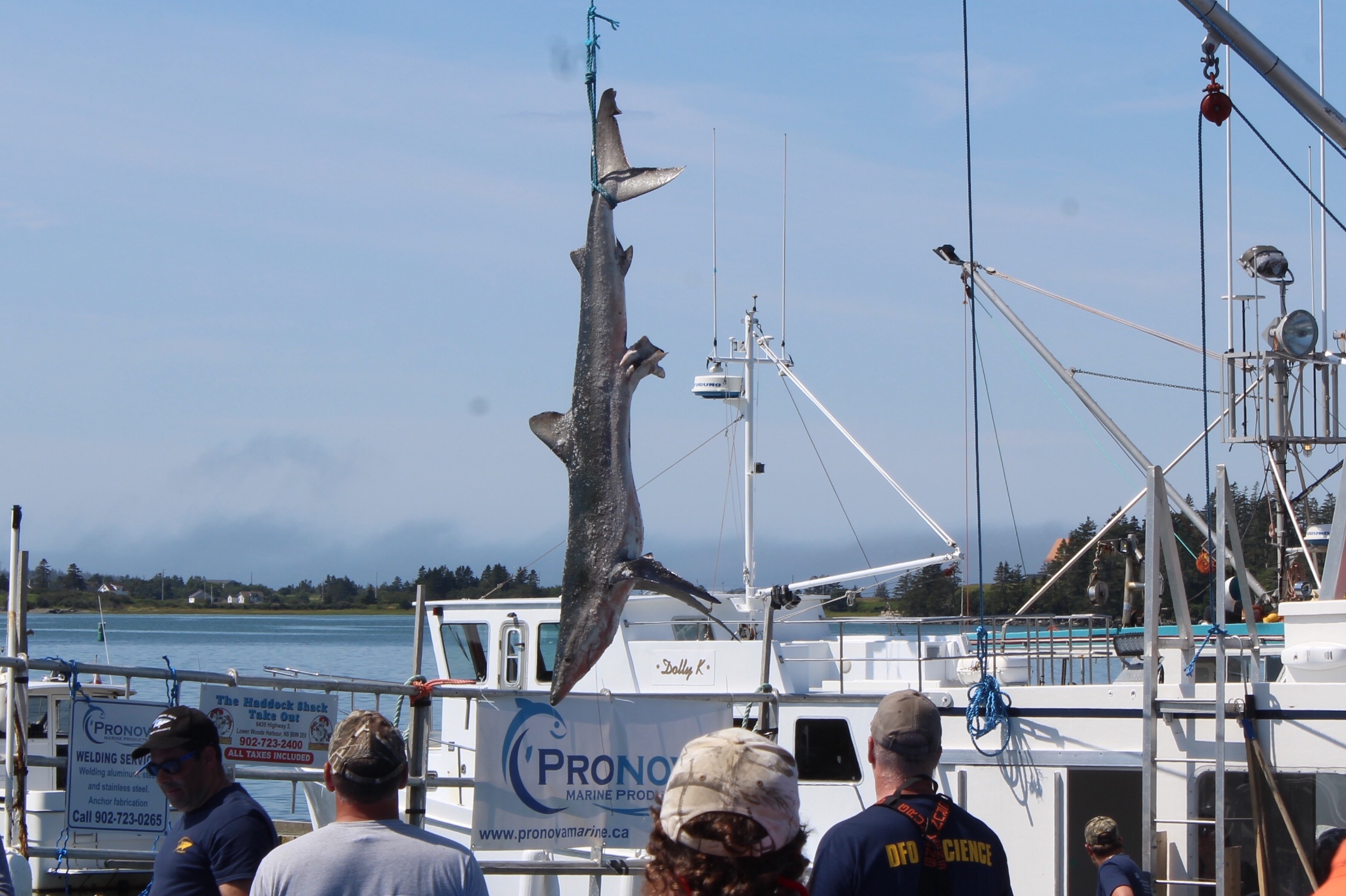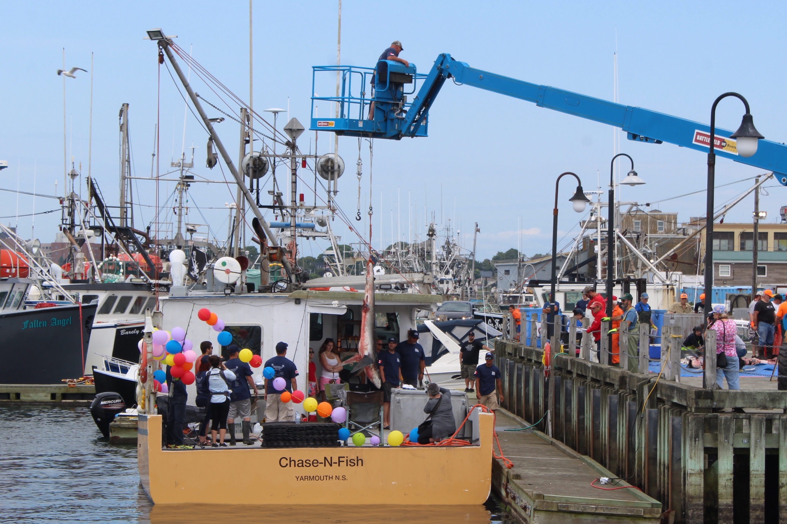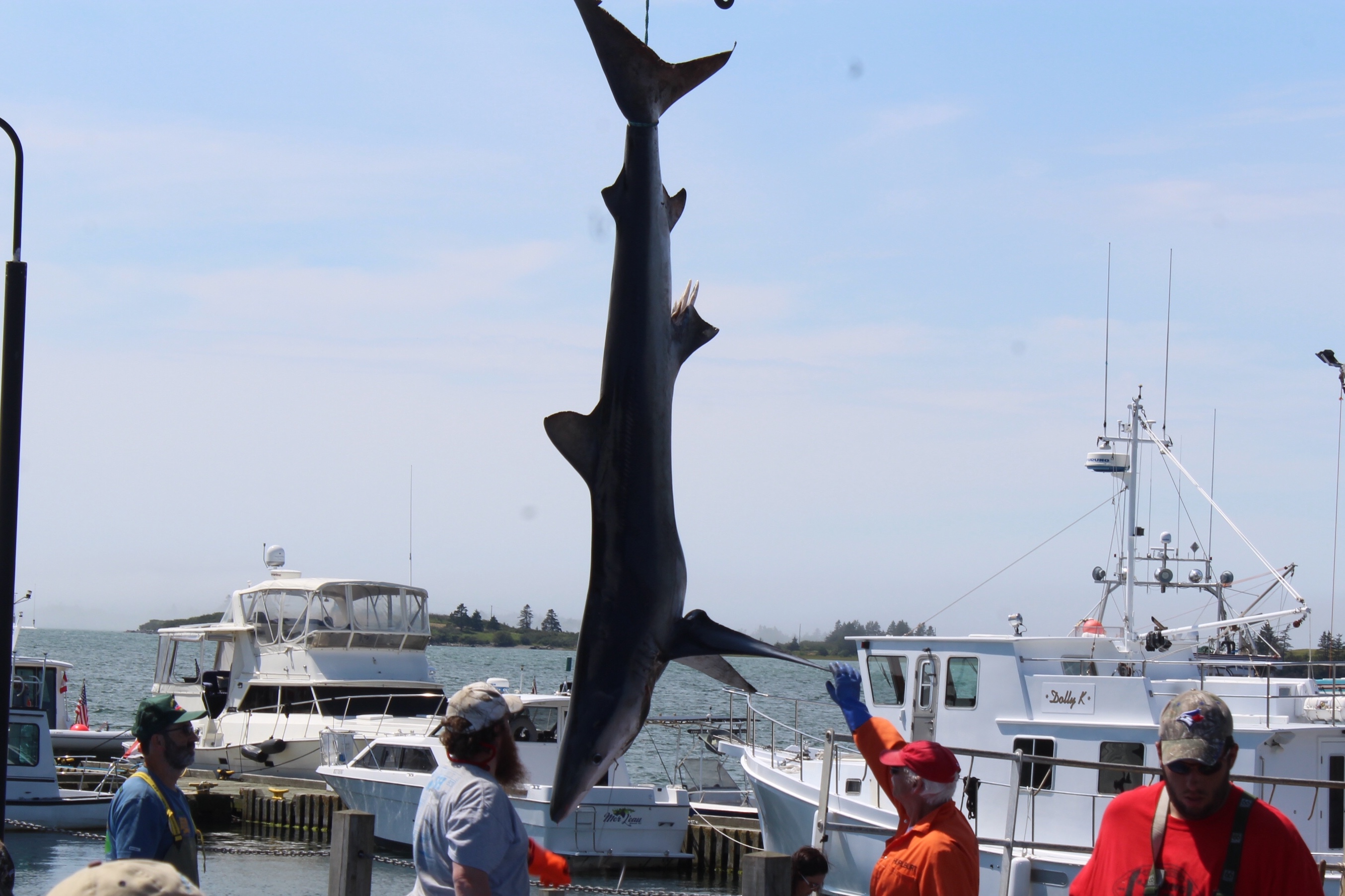 At noon it was time to drift over to the next wharf and watch the weigh in for the Yarmouth Shark Scramble. This was the 21st Blue Shark Tournament. There were 15 boats registered who had 5-7 people onboard who were fishing for shark. Each boat could weigh in three sharks.