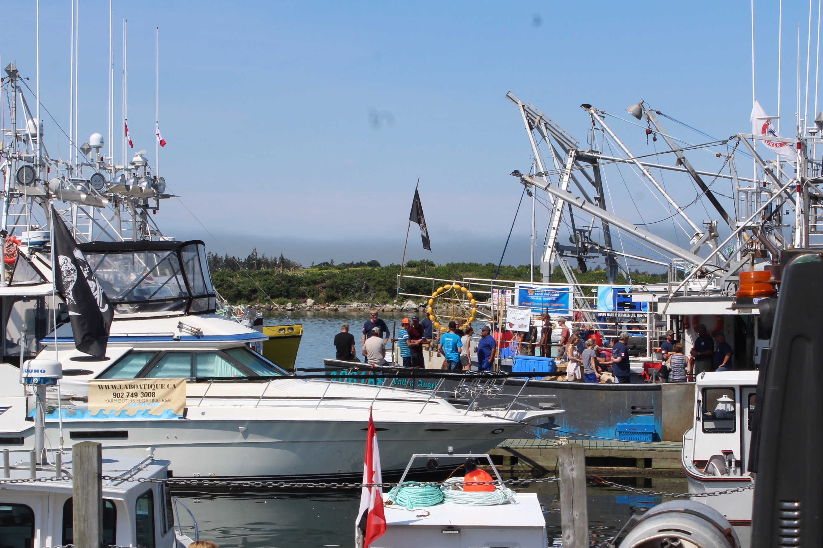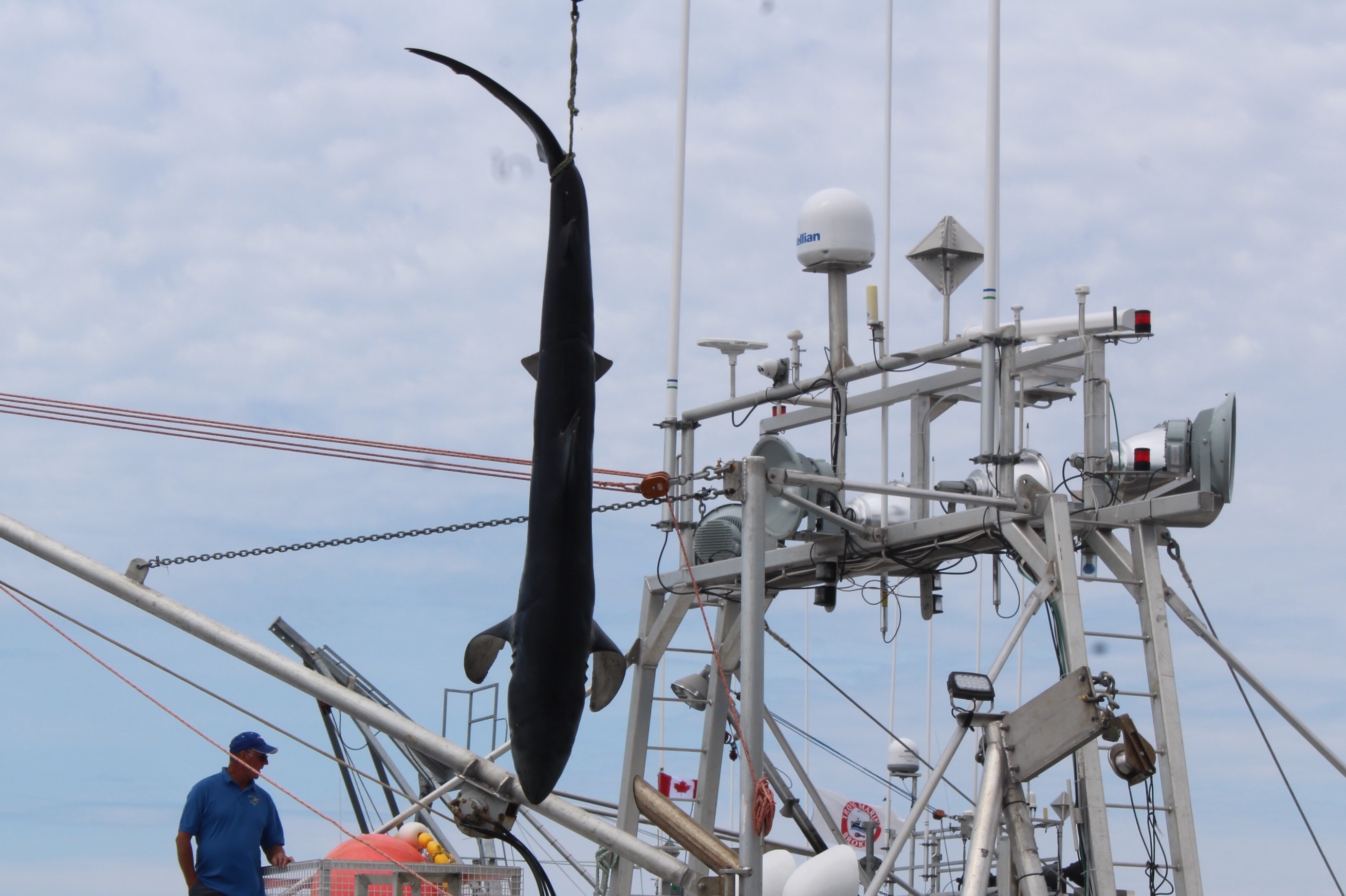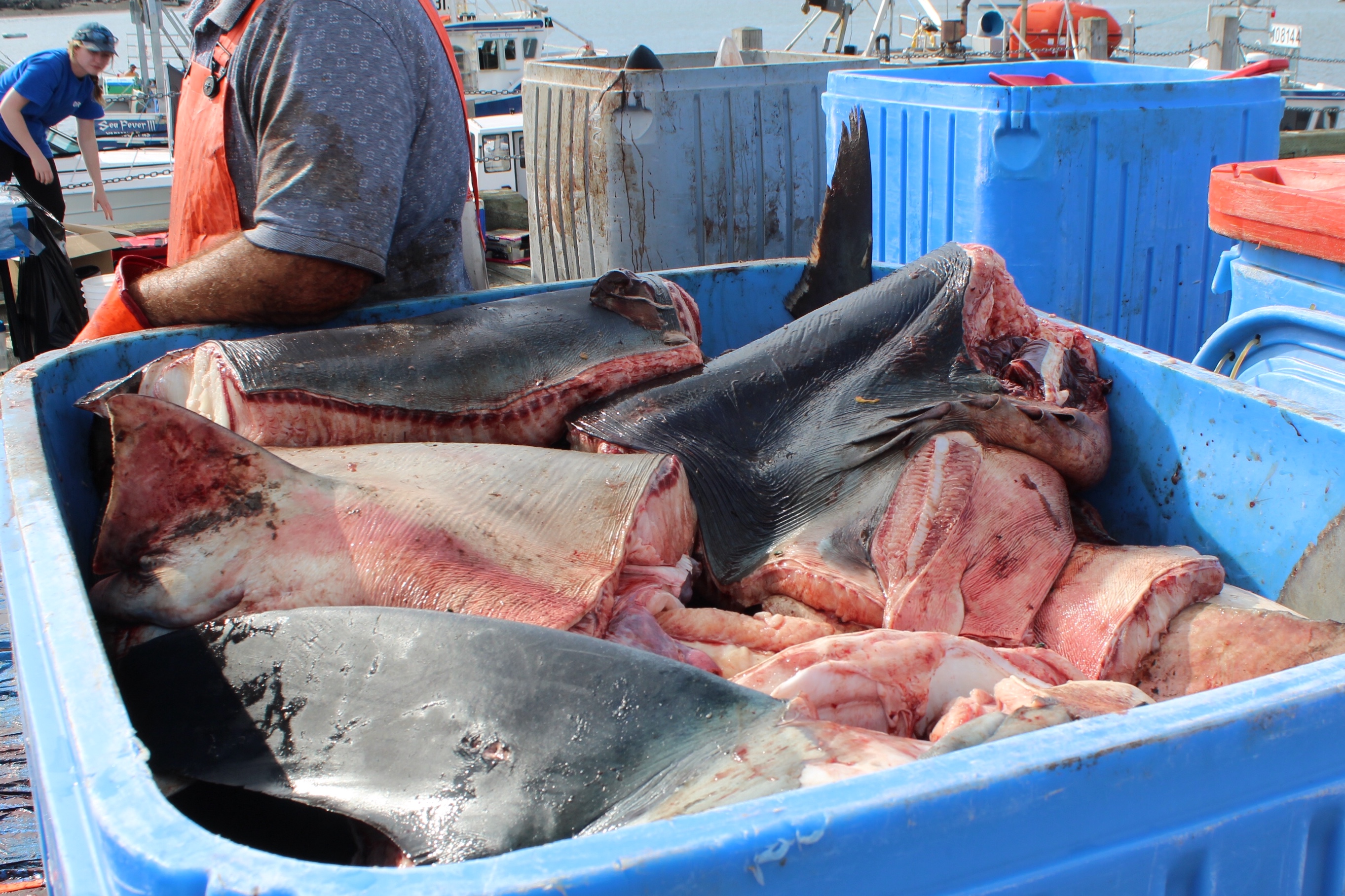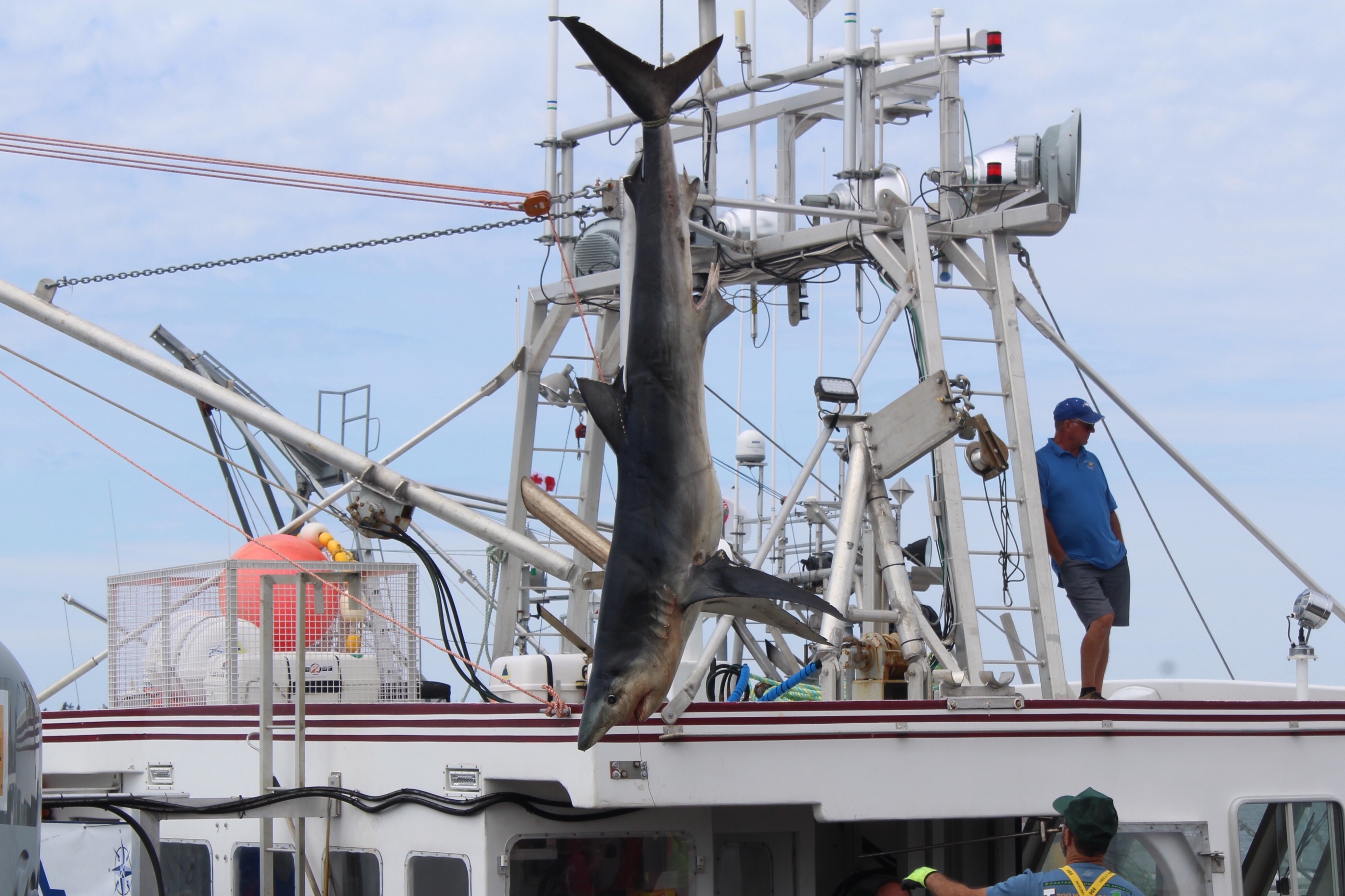 At noon it was time to drift over to the next wharf and watch the weigh in for the Yarmouth Shark Scramble. This was the 21st Blue Shark Tournament. There were 15 boats registered who had 5-7 people onboard who were fishing for shark. Each boat could weigh in three sharks.