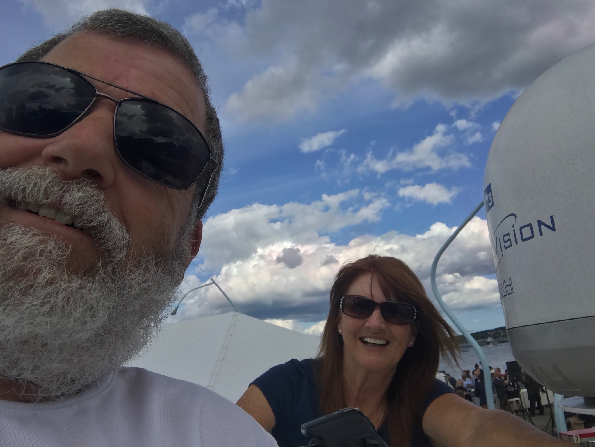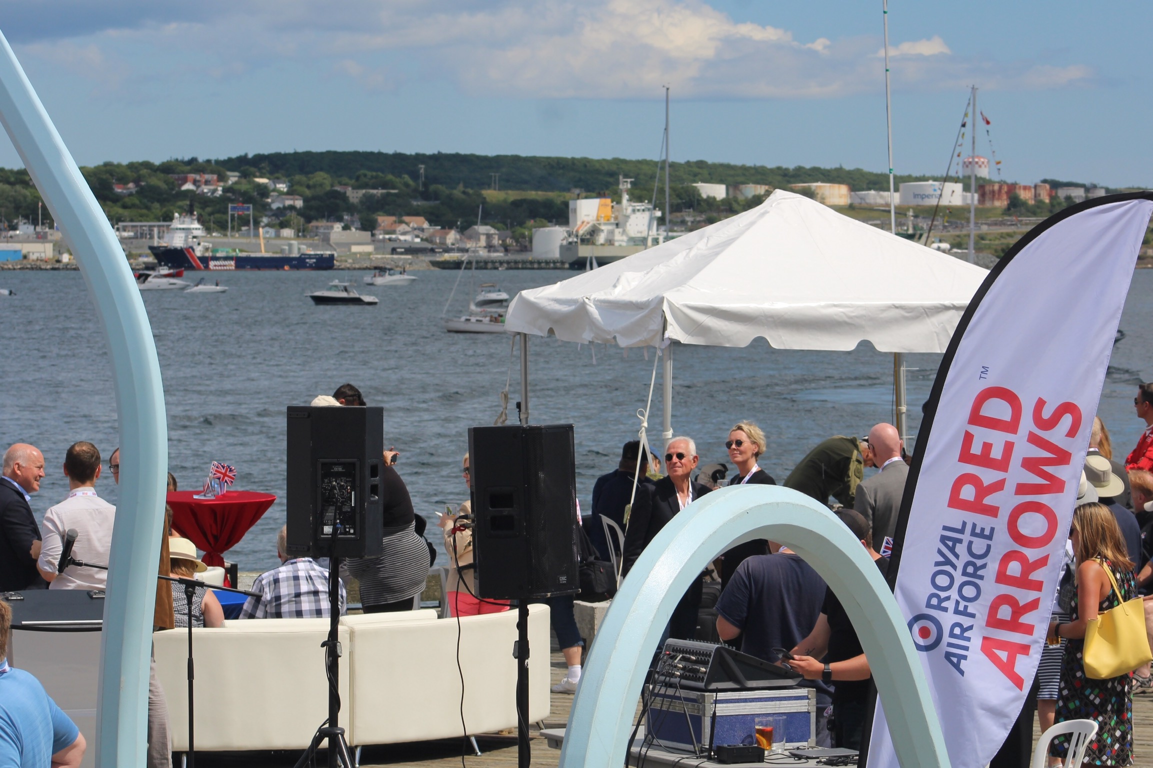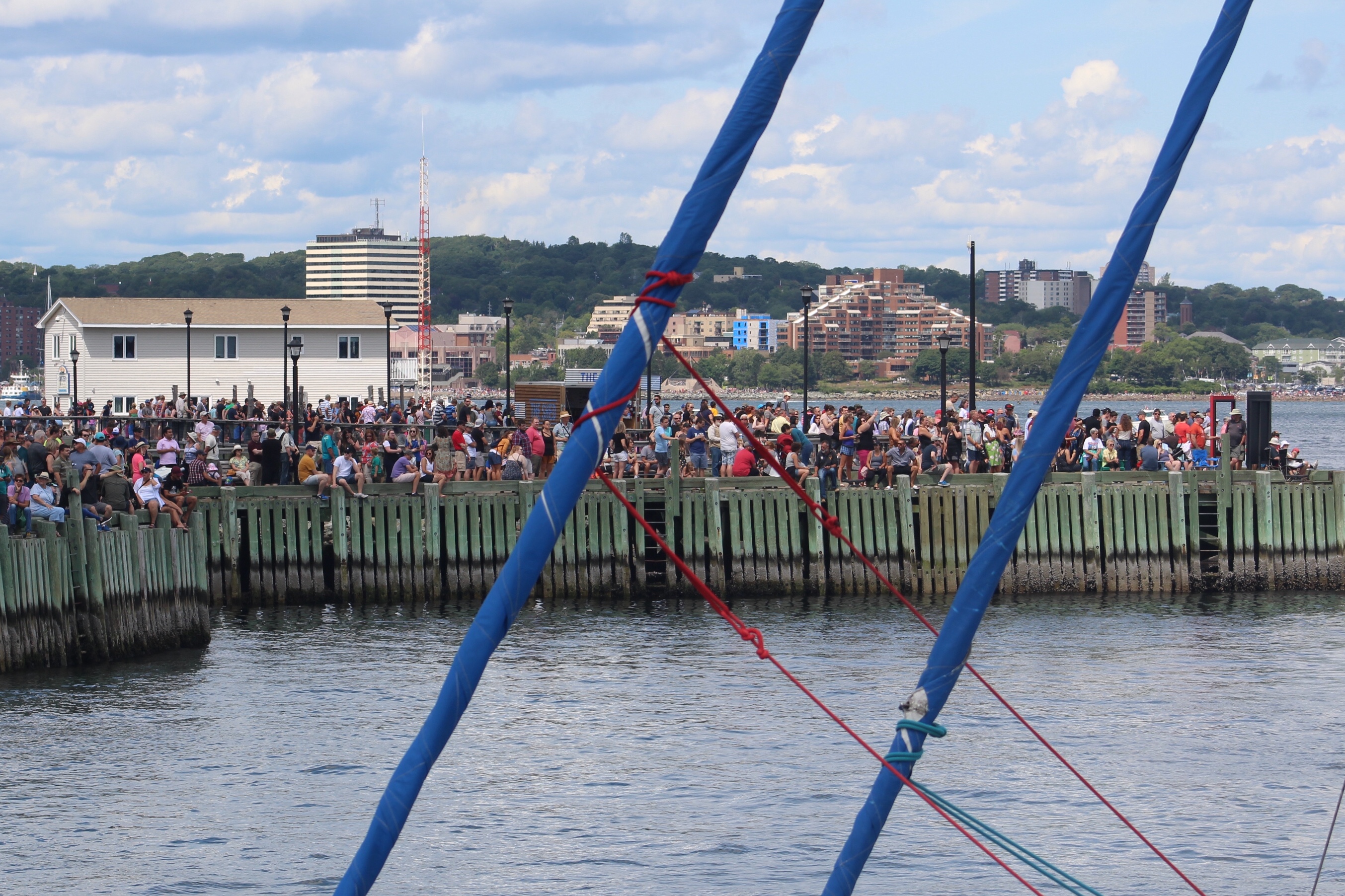 The dock that the crew had been moored to since arrival in Halifax was exposed to the ocean swells and boat wakes, which made for an uncomfortable stay on the boat. The skipper talked with the marina and got permission to move over behind a wall that would block the wave action. Once they got settled, they climbed up on top of the radar arch to take their seats behind the V.I.P. Tent for the air show.