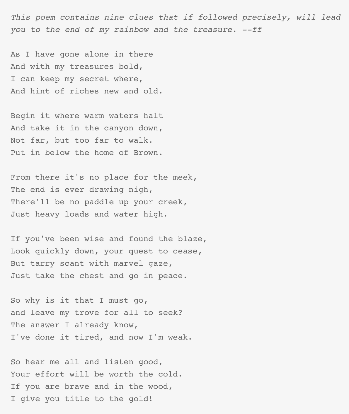 Forrest then wrote a poem, that if you can solve the mystery of said poem will lead you to the treasure trove.