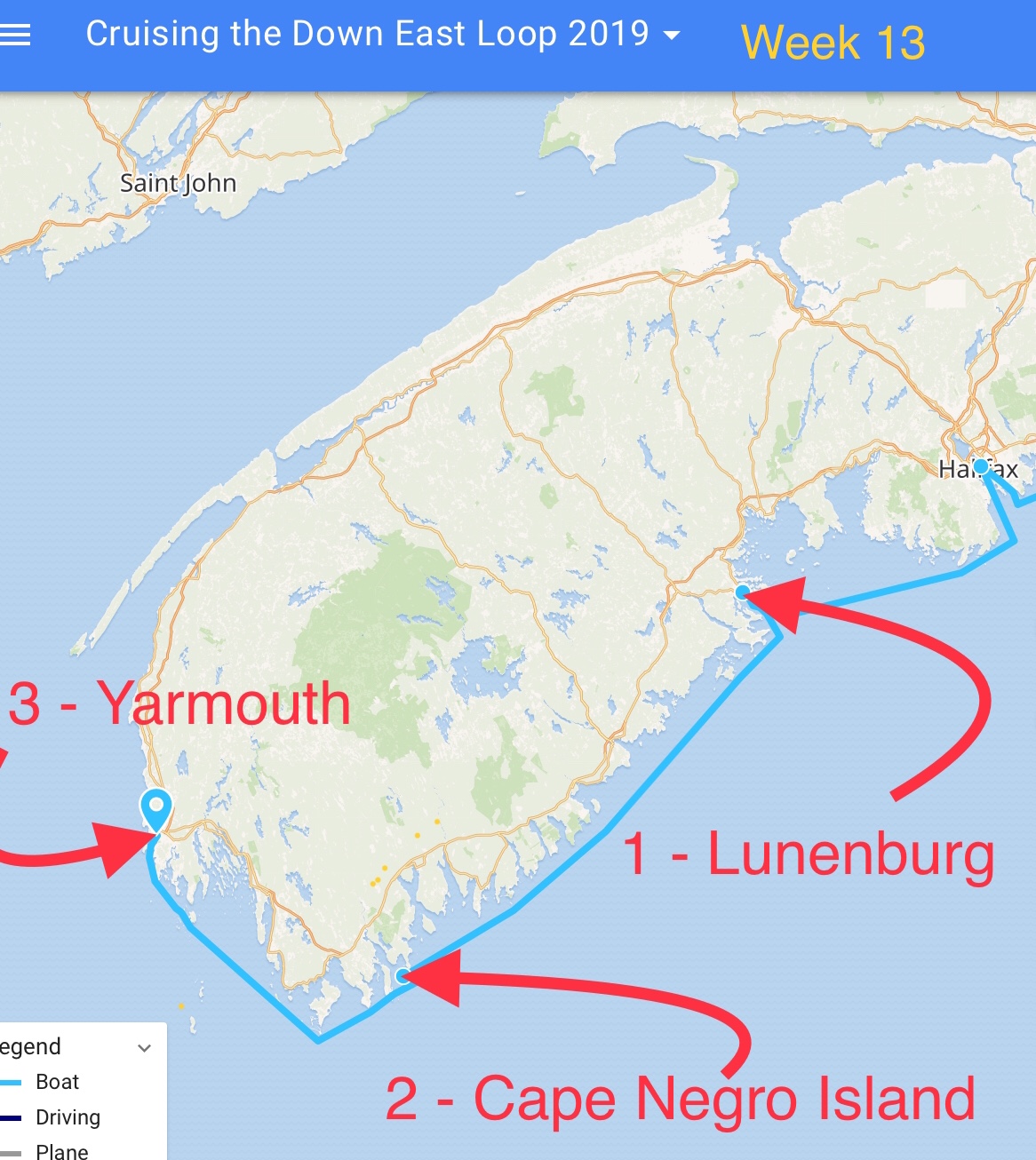 The weather was finally favorable to leave Halifax on Wednesday. The crew shoved off the dock and cruised to the small village of Lunenburg. They left the next morning and found sea conditions to be about perfect. Rather than stop at the anchorage they had planned, they put another 40 miles under the keel and anchored at Cape Negro Island. On Friday, they motored to Yarmouth.