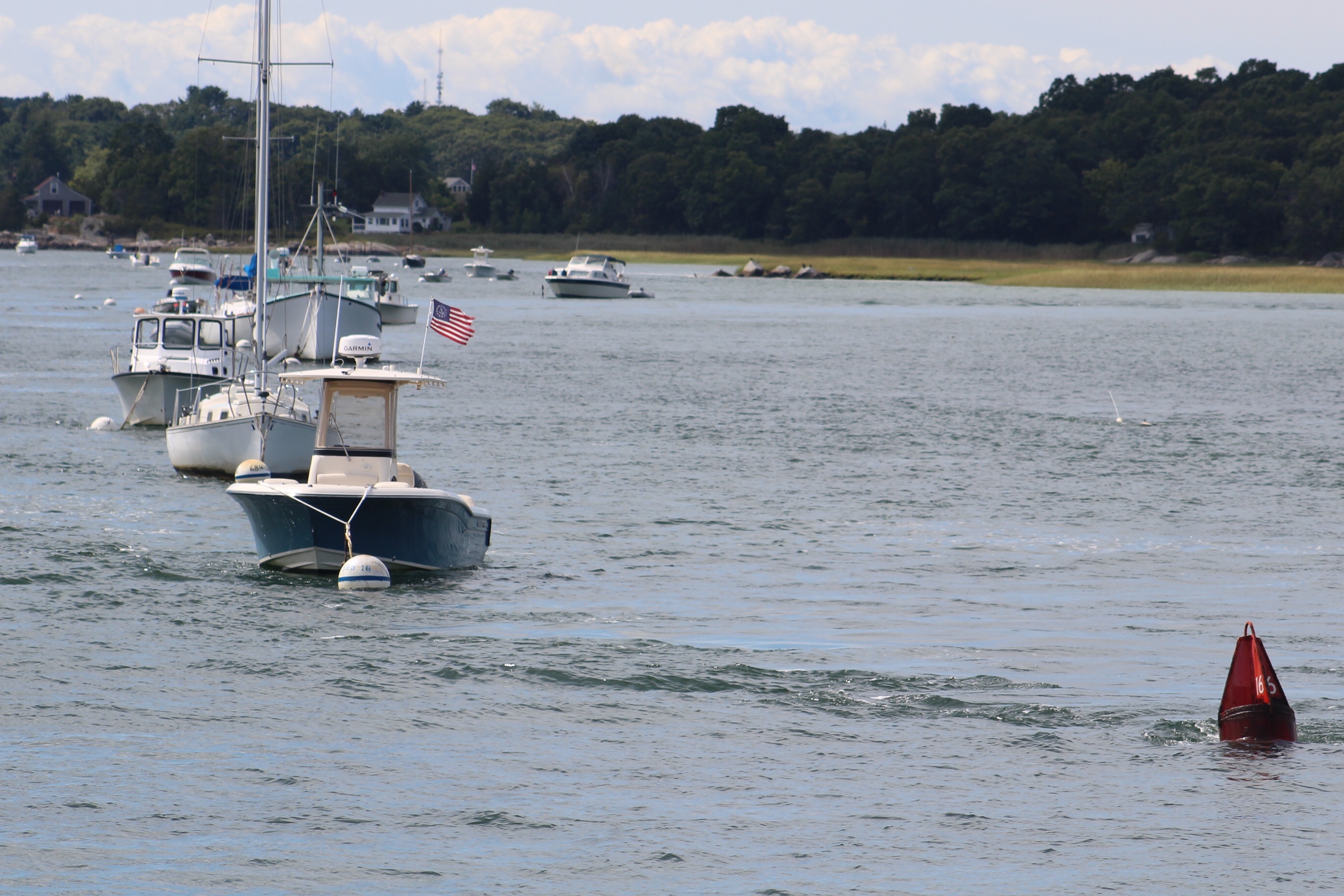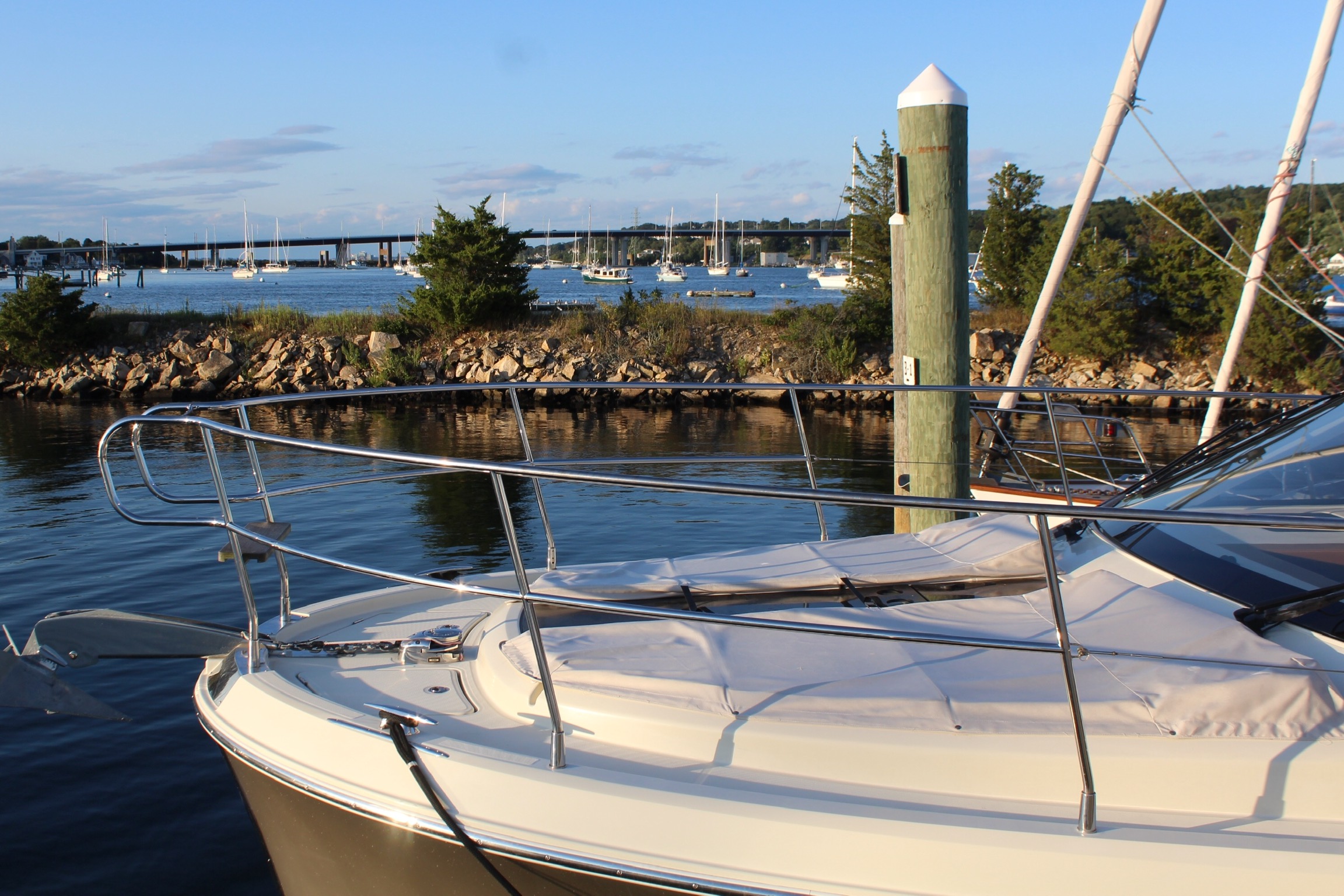 The crew timed their arrival at the Cap Cod Canal just about perfect and got a couple knot current push as they transited the Canal. The skipper had noticed that Confetti had left an Active Captain review about some mooring balls on the west end of the Canal. The balls do not have any line attached so you have to attach your own line to the ball. Confetti explained how they were successful, so our crew replicated the method. It took three tries to grab the ball because of the wind, but once the crew had the ball they were able to thread the needle and get the ball secured to the bow of the boat.