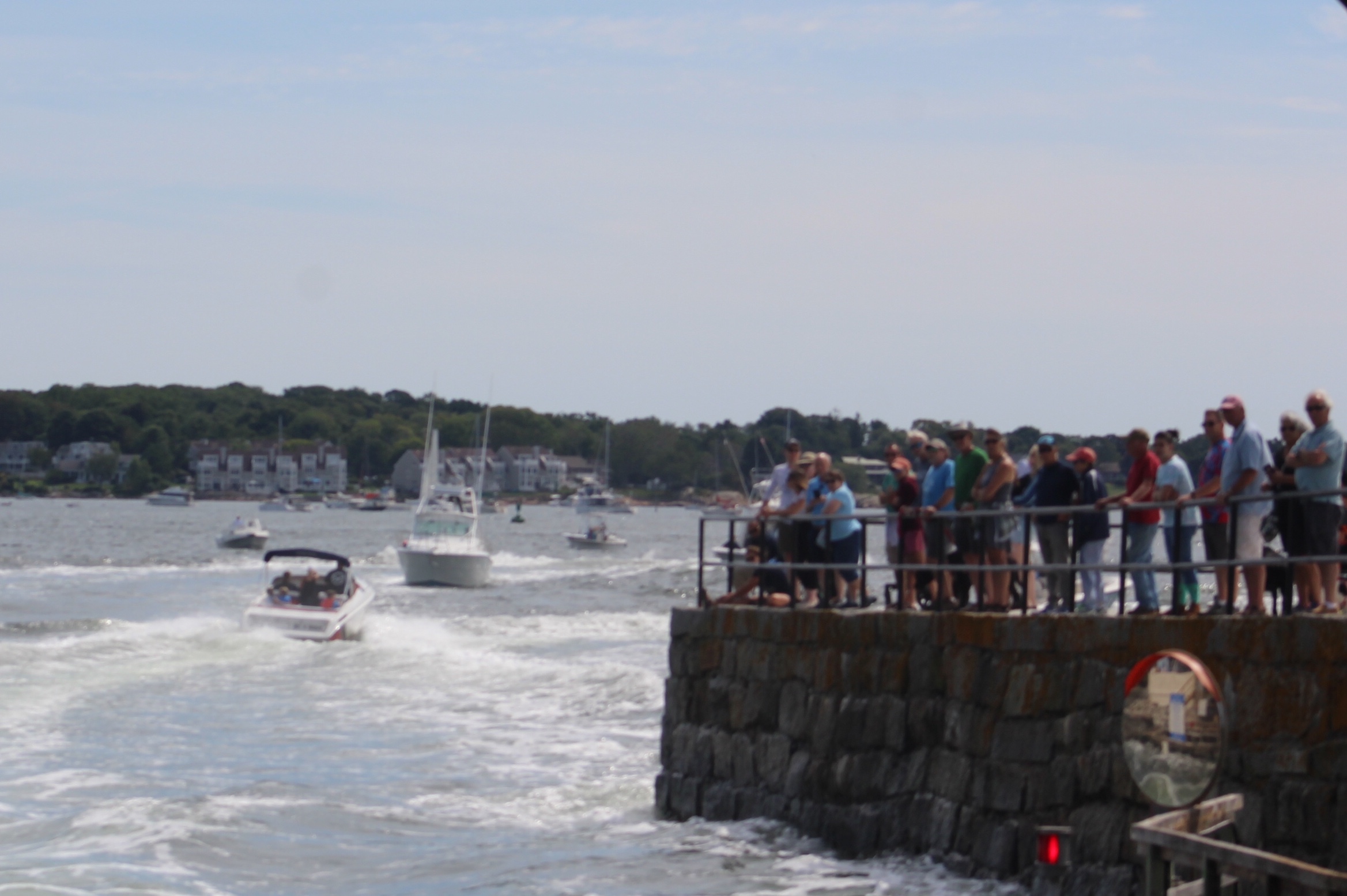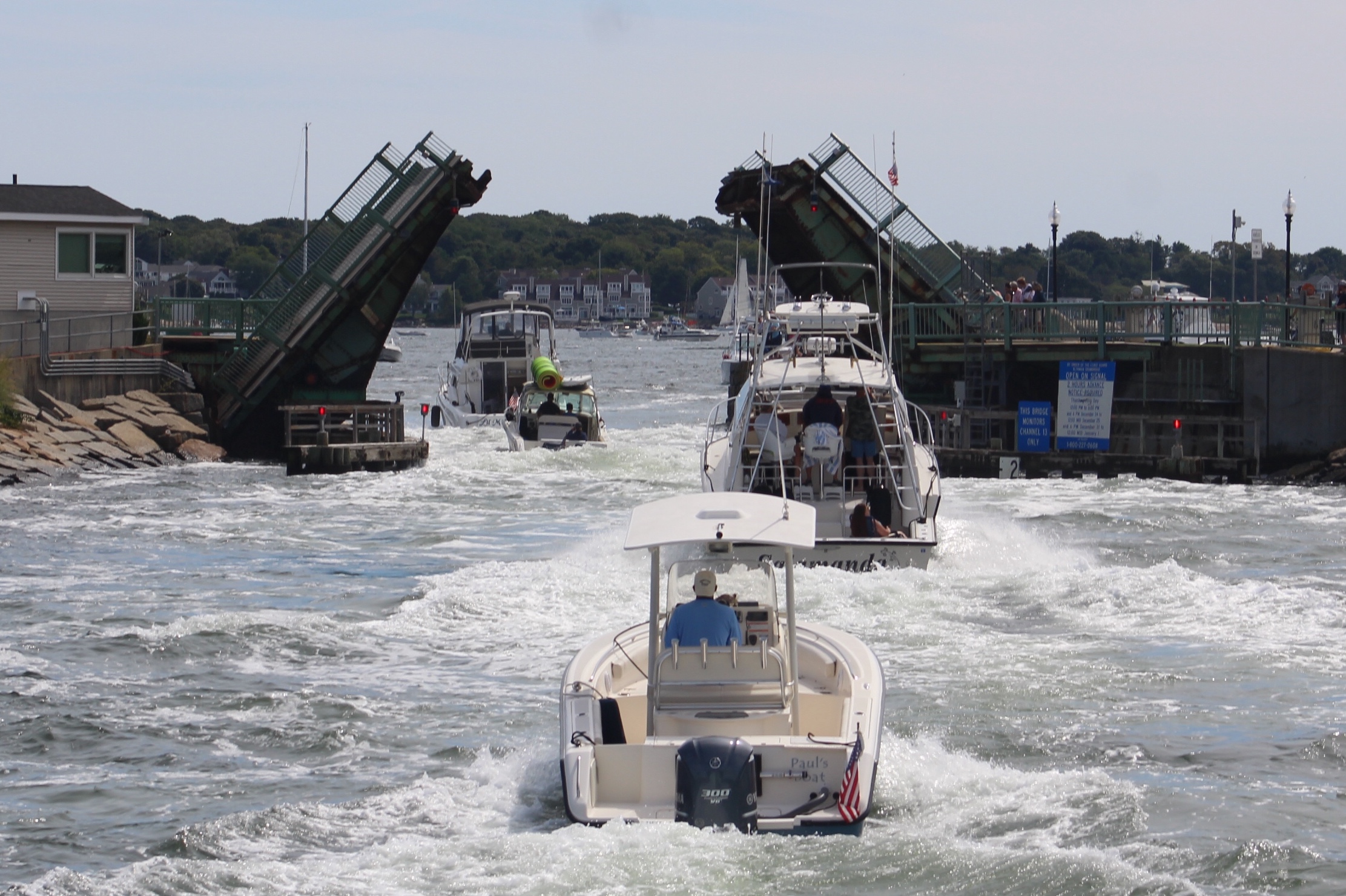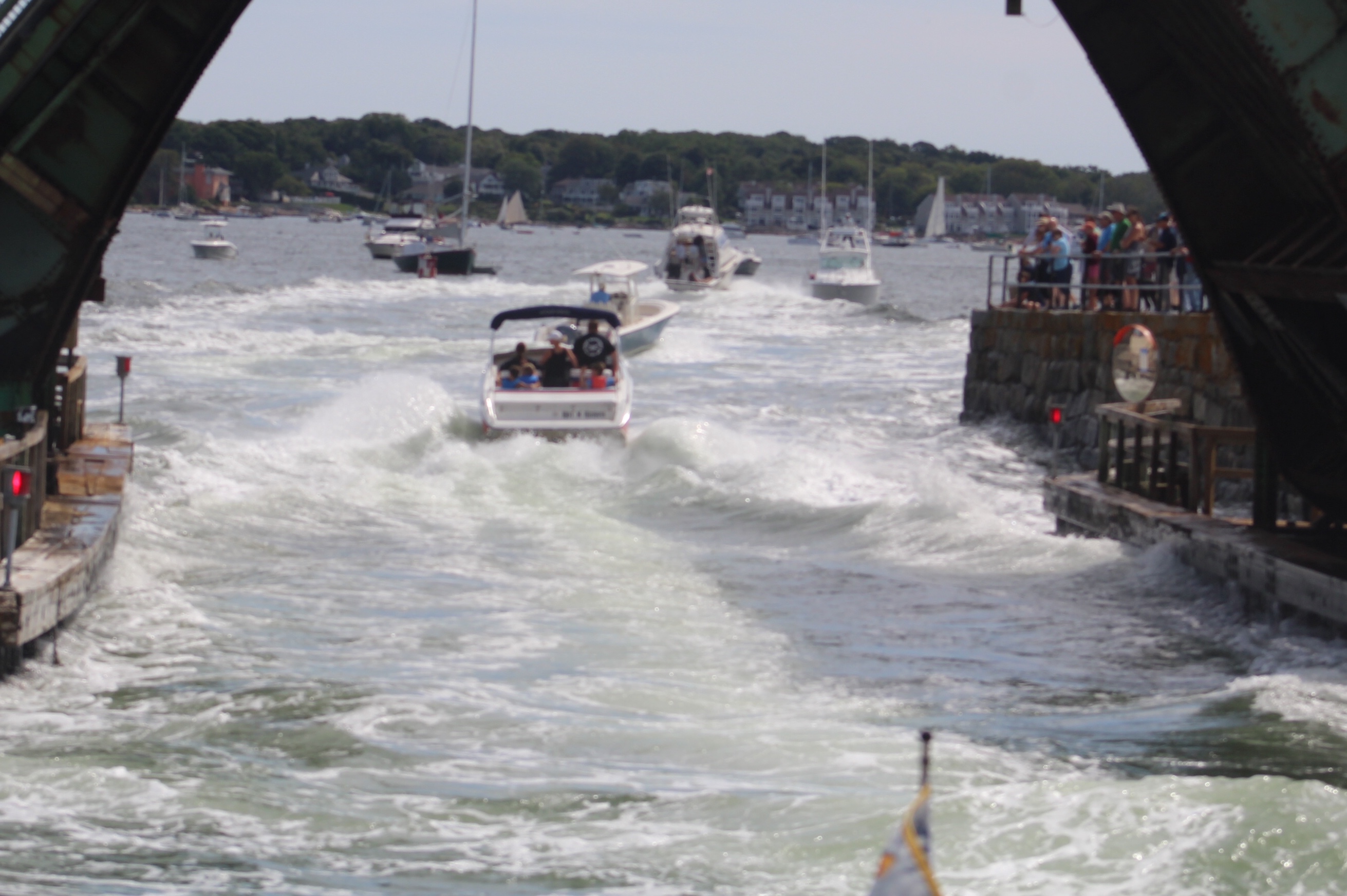 The current was running about 3 knots under the narrow bridge towards the waiting line of boats. Once the bridge opened it was total chaos as the boats all speed up to make the bridge. The wave action was horrendous, and a crowd of folks had gathered on the other side of the bridge to watch the action. I think they were hoping to see and hear some fiberglass crunching.