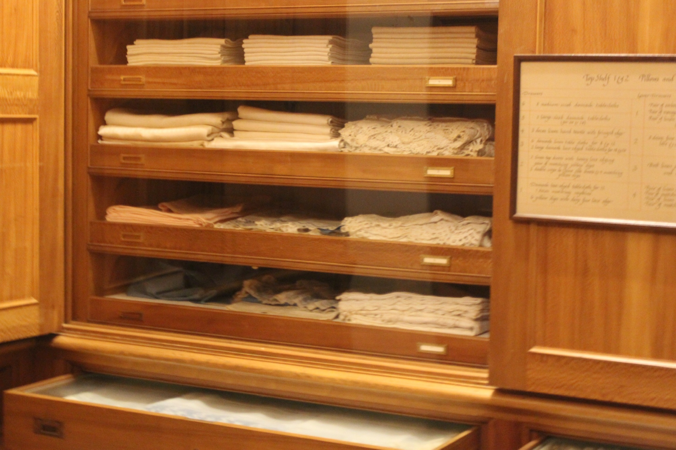 One interesting backstory about the cottage was the duties of the head house maid. She was tasked with making sure none of the linens/satin napkins did not disappear. This was no easy task when you realize that at one ball they would serve at least 200 guests in a 16 course French dinner. She had to count the linens when they came out of the closet, when they went to the washing area, when they went to be dried, and lastly when put back in the linen closet. Why all the security over a napkin you ask? One of those gold lined satin napkins was worth more than the servants made in the two month season in Newport.