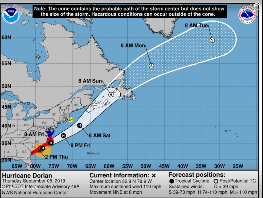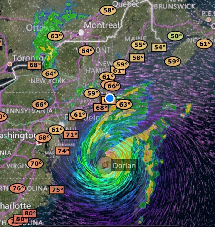 Overnight the winds stayed below 25 mph, and the well protected marina was surprisingly calm. Dorian has moved off from Cape Cod and has tracked towards Nova Scotia. It will be interesting to see how much damage the ICW has encountered once the crew heads south from Norfolk in a few weeks. But it does appear that the initial storm damage reports from Florida to New England are better than expected with little loss of life.