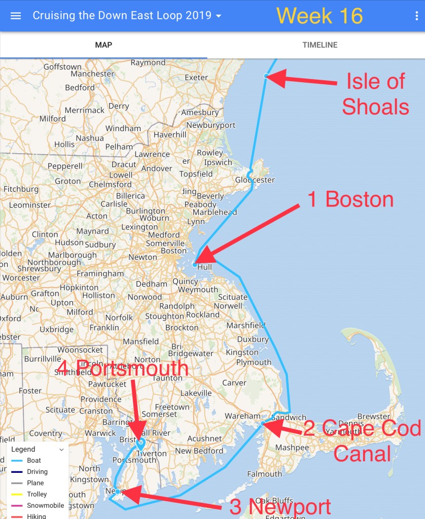 The crew set off from the Isle of Shoals on Monday, but could find no place to stay in Gloucester. Consequently, they moved on and dropped anchor in Boston. Tuesday, they moved down to the Cape Cod Canal and found a mooring ball for Tuesday night. Then it was on to Newport where they spent Wednesday and Thursday nights on a mooring ball. With Hurricane Dorian looming on the horizon, the crew went about 15 miles further north to Portsmouth for the weekend, and to allow Dorian to pass.