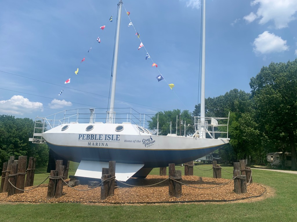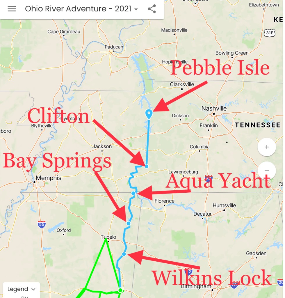 The crew left the comfort of the Columbus Marina and made way north on the Tenn-Tom Waterway to begin to stage for their Ohio River Adventure. After one night at anchor, near the Wilkins Lock, the crew pulled into Bay Springs Marina to discover 30 gallons of fuel in the engine room bilge. It took two days to clean that mess up, and correct the cause. After the cleanup was complete, the crew next ventured to Aqua Yacht Harbor where they ‘discovered’ The Outpost. They next moved to Clifton where they enjoyed conversing with Susan, one of the new owners of the marina, while they had a sumptuous hamburger. They concluded this week by navigating up to Pebble Island Marina and dodging some 300 plus pontoon boats plying the Tennessee River.