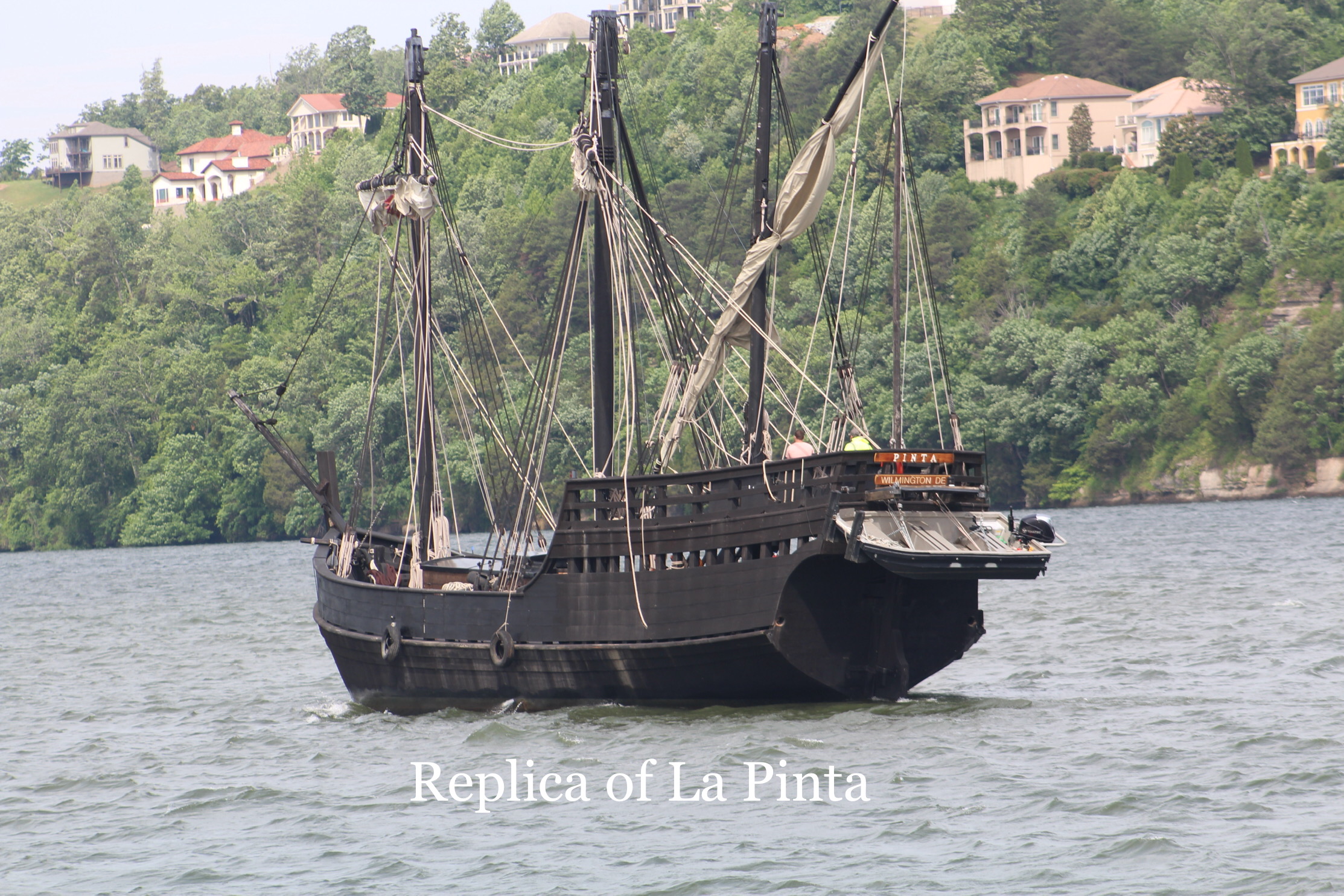 When the crew arrived at Pickwick Lock, there was a strange looking pirate ship circling and waiting on a tow to leave the lock. There was also a tow in the que waiting for its turn to lock through. The skipper called the Lock Master and was pleasantly surprised that they would get to lock through with the pirate ship as soon as the tow left the lock. The crew followed the pirate ship into the lock and learned that looks can be deceiving, the pirate ship turned out to be a replica of the Pinta, one of Christopher Columbus’ three ships on his maiden voyage across the Atlantic Ocean.