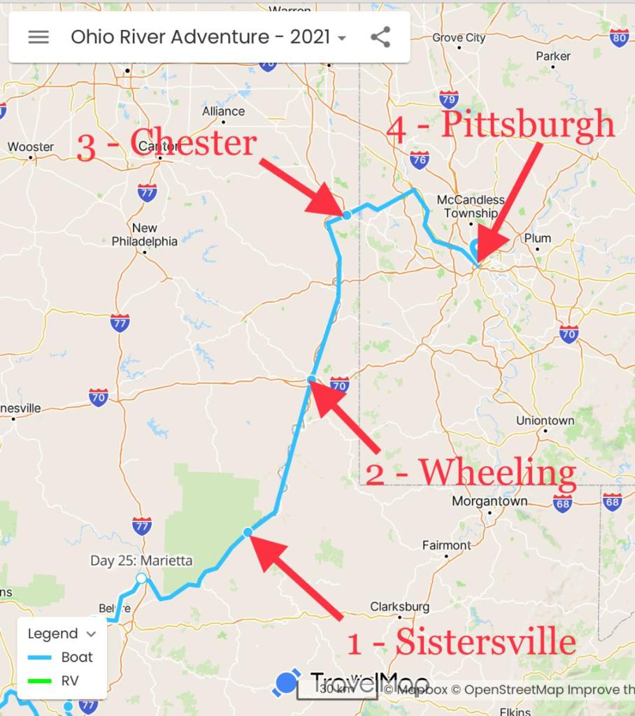 This week the crew traveled four days to arrive in Pittsburgh at mile Zero on the Ohio River. They made the following stops along the route: 1 – Sistersville where they landed at the town courtesy dock, 2 – Wheeling where they landed on the town public dock, 3 – Chester where they stayed at the Holiday Yacht Club two nights to allow some rainy weather to pass, 4 – Then the crew arrived in Pittsburgh for the 4th of July weekend. The crew could not find a slip anywhere in town so they moored next to the Pirates baseball field and took up residence along the river walk wall. And with even more good news, the Pirates are playing at home Friday, Saturday, and Sunday against the Milwaukee Brewers.