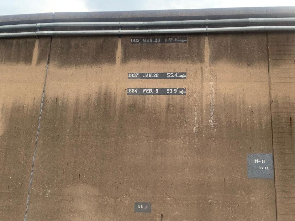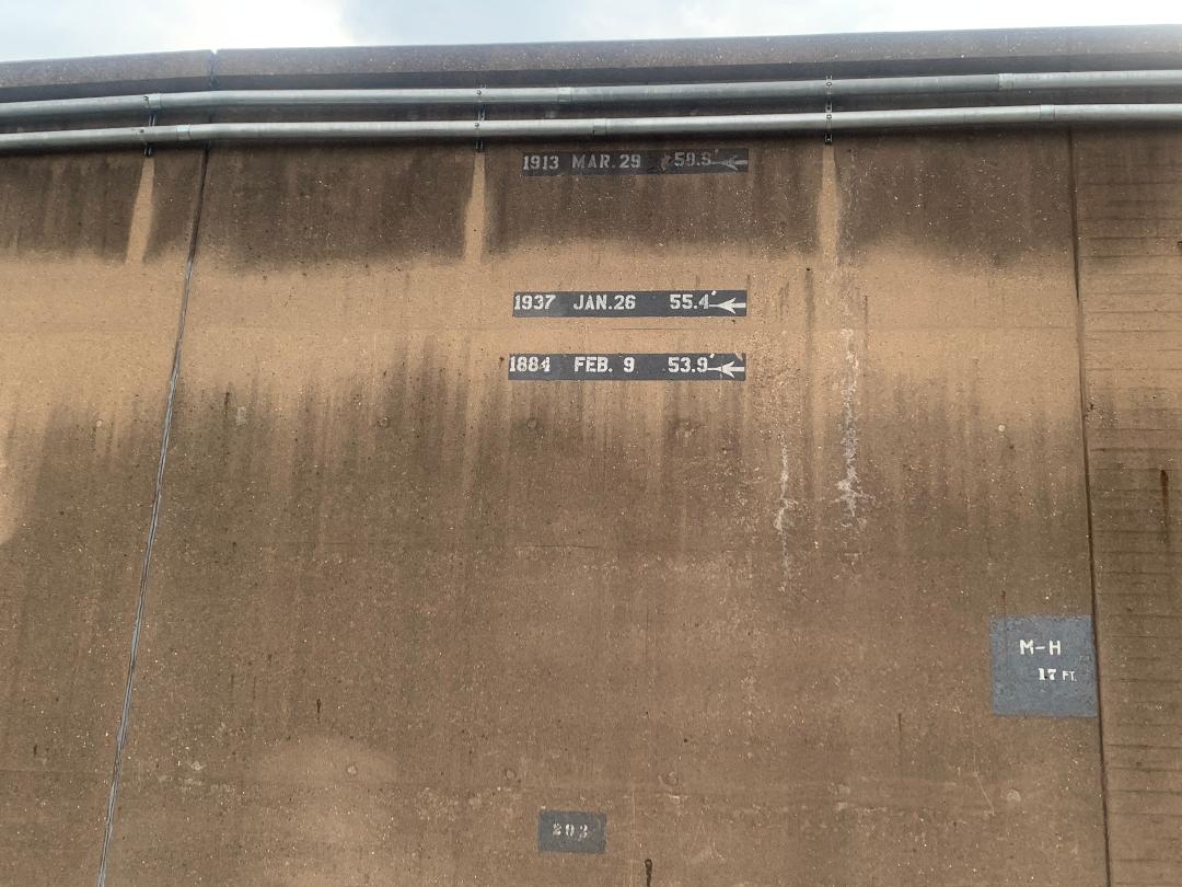 But the crew found these marks on the 21 foot flood wall that was built in 1950 for the price of $6 Million. These are the three worst floods in the towns history. The top of the wall is designed to be three feet higher than the 1913 flood crest of 58.6 feet. Parkersburg has also just announced a Flood Wall Mural Project. They plan to use a local artist, Chistopher Santer, to paint the wall. The first approved mural will be the first few notes and words from “Country Roads” by John Denver.