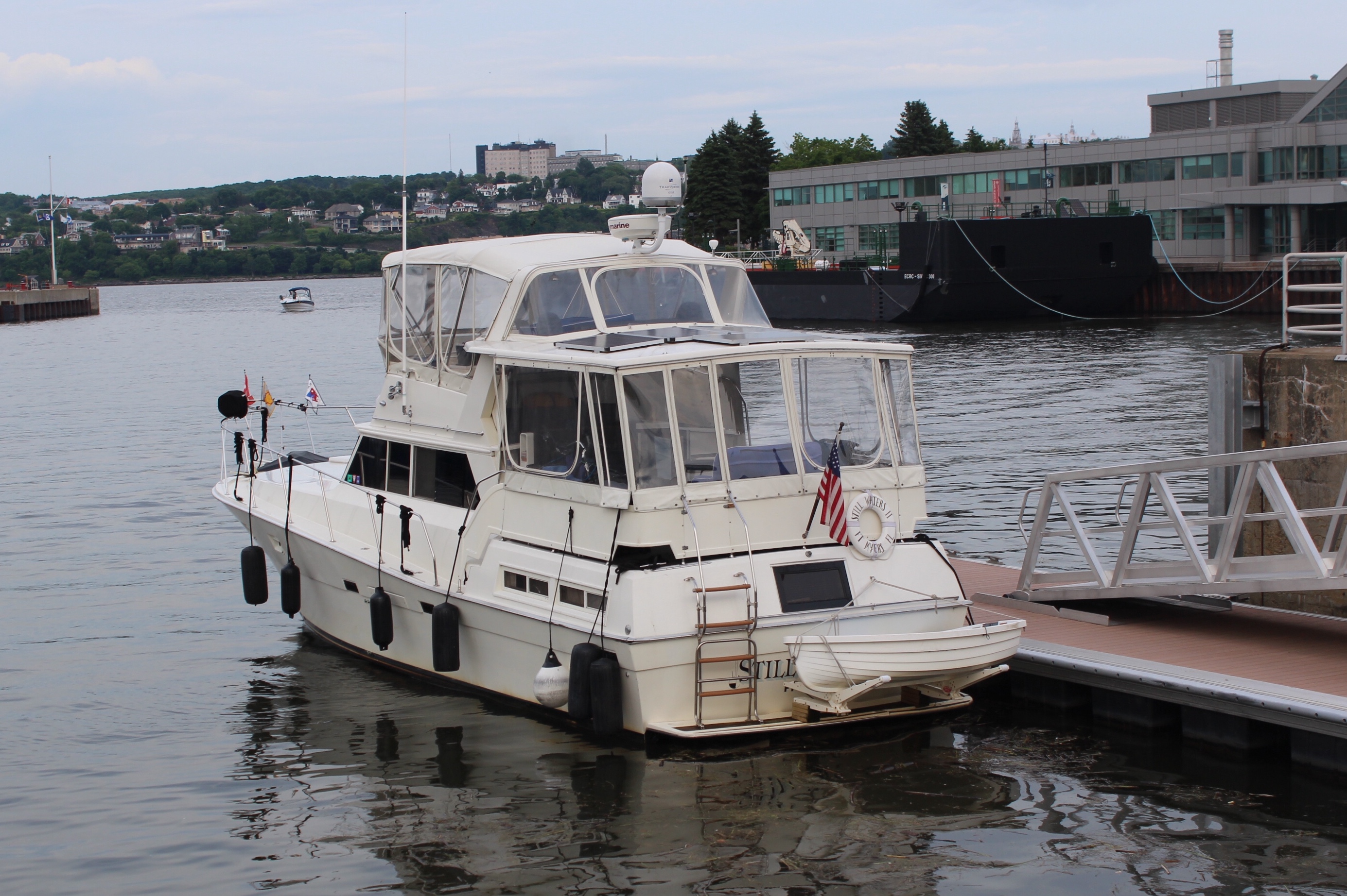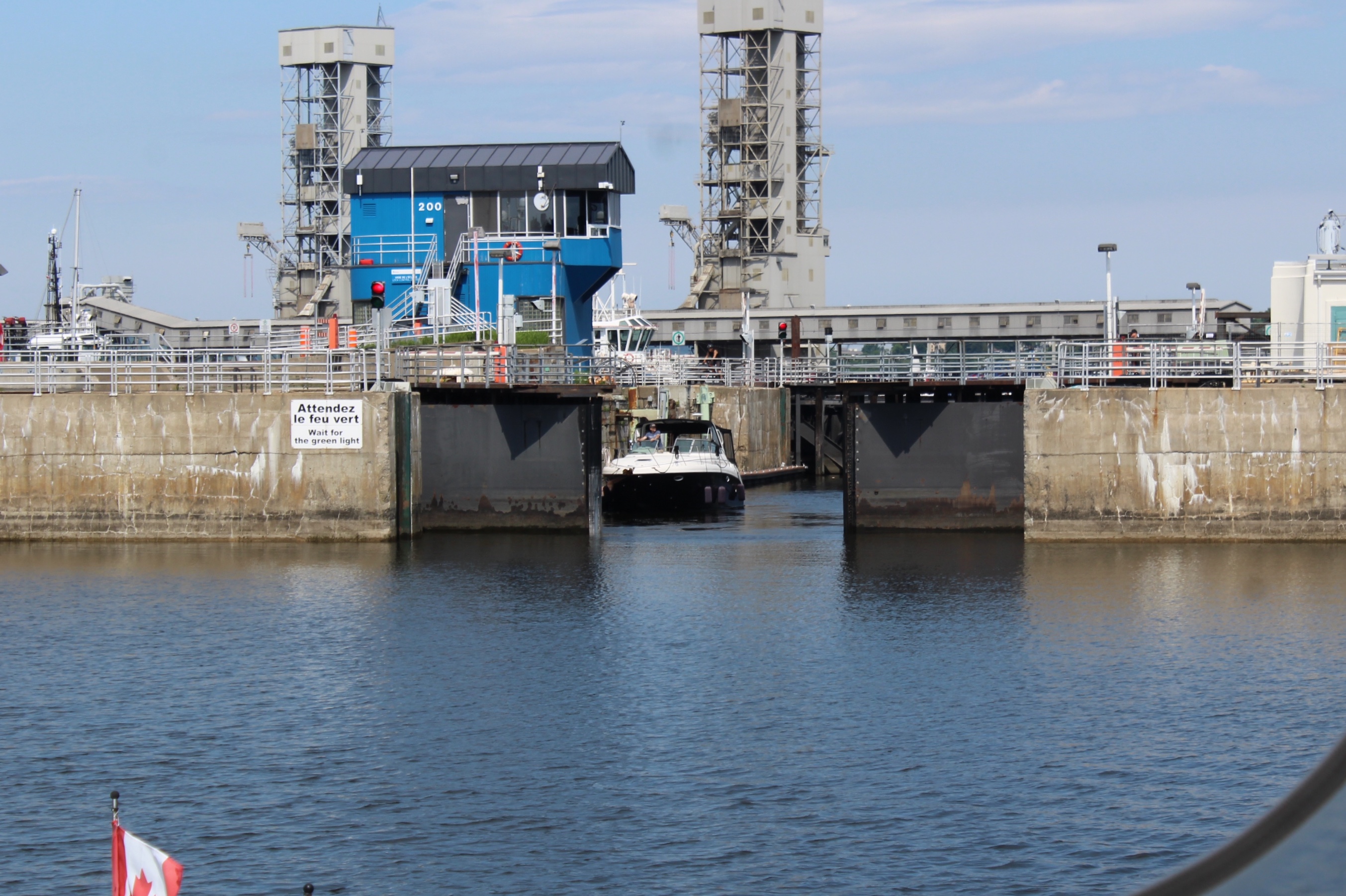 The crew spent the day preparing for departure into the Charlevoix region of Quebec. After going to the local grocery for provisions, the crew moved the boat thru the lock guarding the marina basin, and took a spot on the floating dock.