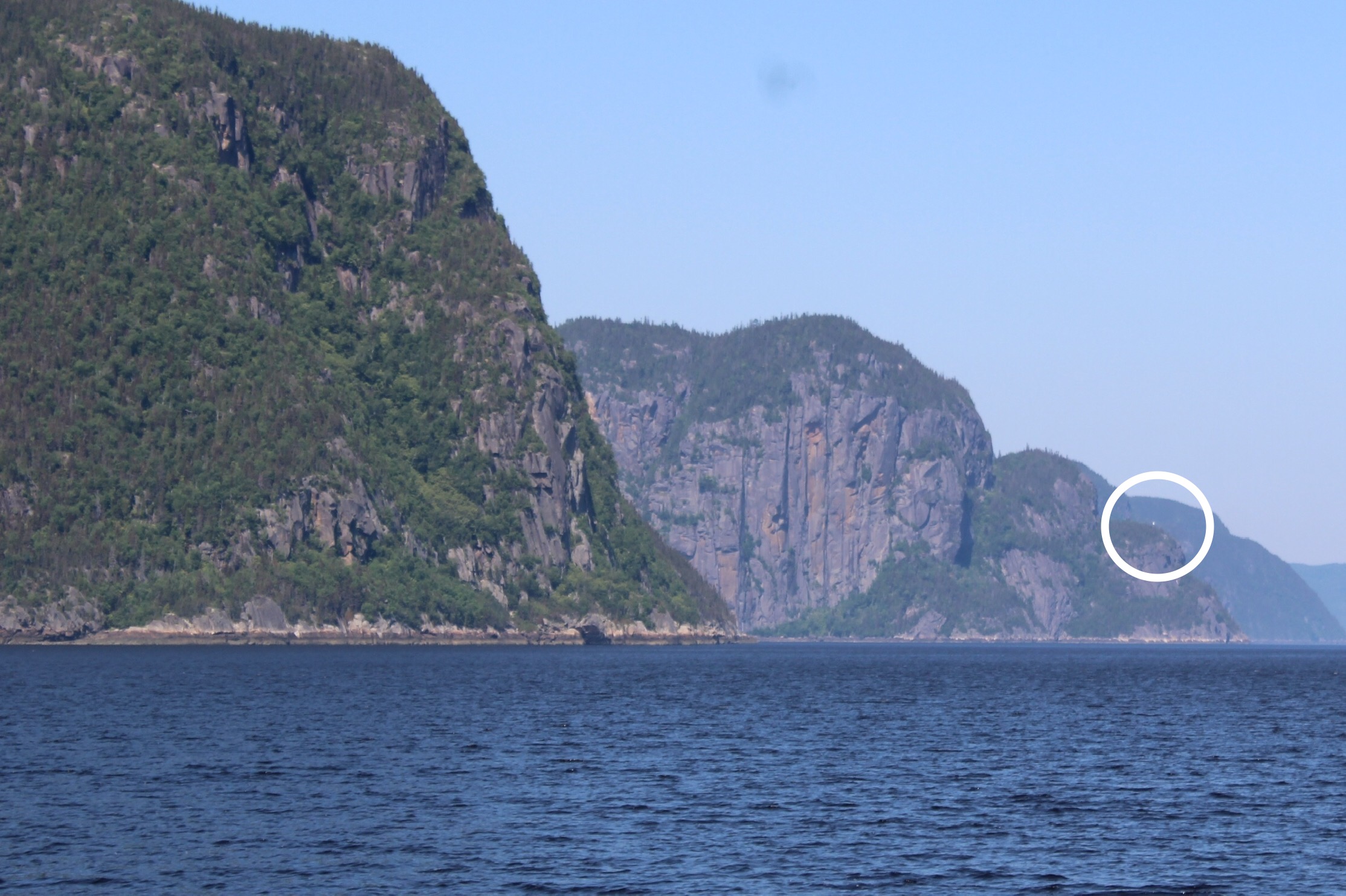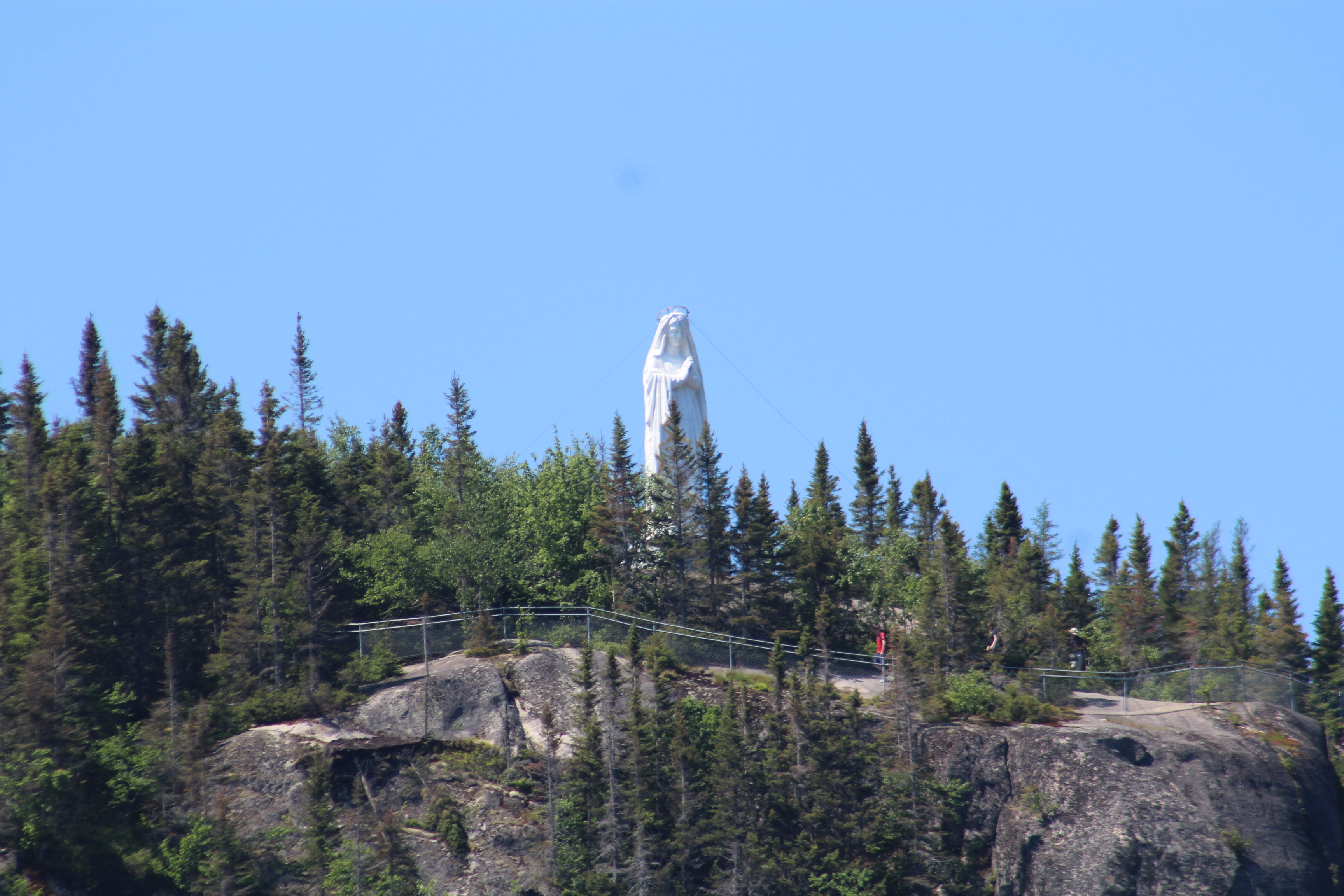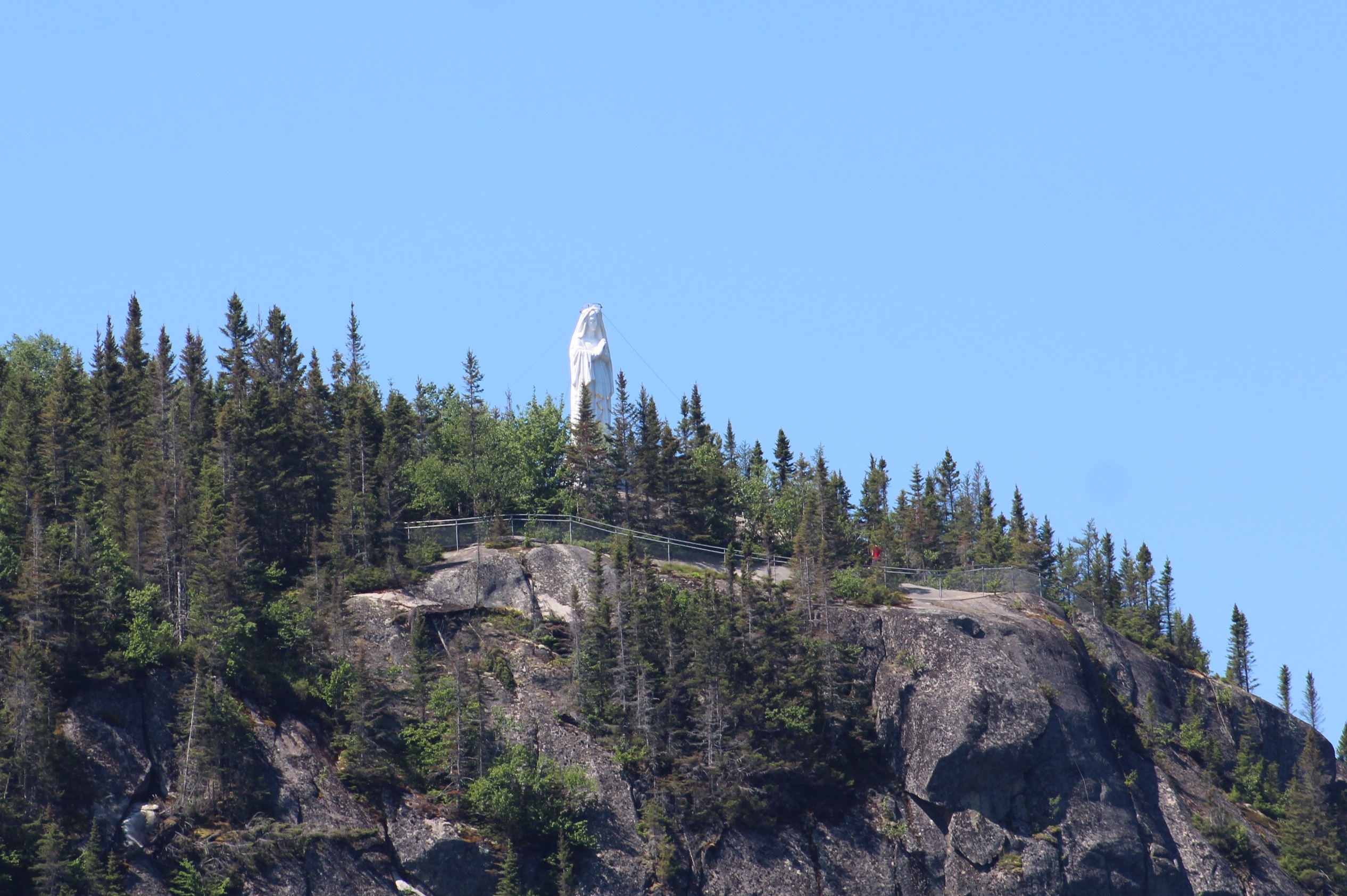 The crew made way to the Bay of Eternity up the Saguenay Fjord. The main goal was to see the statue that sits atop a hill at the entrance to the Bay. The crew could make out the white statue several miles before they arrived. As they approached the entrance, the statue grew is stature and came to dominate the point.