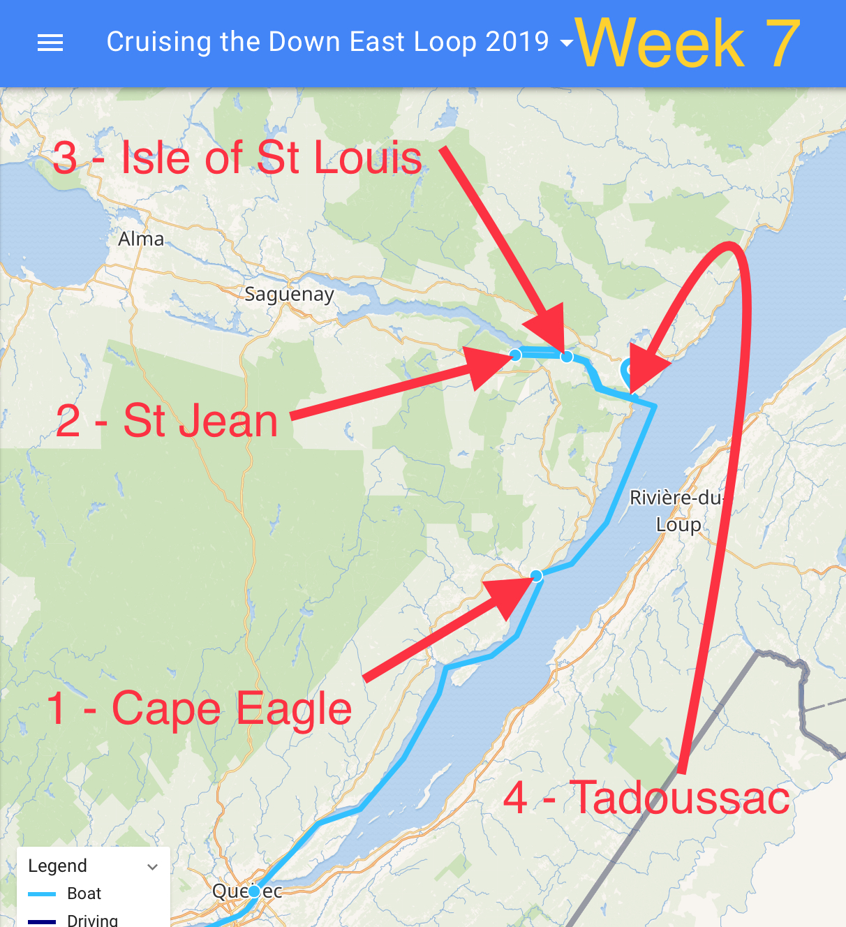 The crew made four voyages this past week. They left Quebec on Tuesday and took a marina at Cape Eagle (1) in the evening. Then it was a foggy morning on Wednesday as they made their way into the Saguenay Fjord and stayed at the St Jean marina (2). Thursday, the crew went further up to the Bay of Eternity, then turned around and anchored a couple nights off the Isle of St Louis (3). They ended the week with a voyage to Tadoussac (4) on Saturday morning. The crew has lost count of the number of Beluga Whales they have seen in the past week, but the number is easily over a dozen and probably approaching 20.