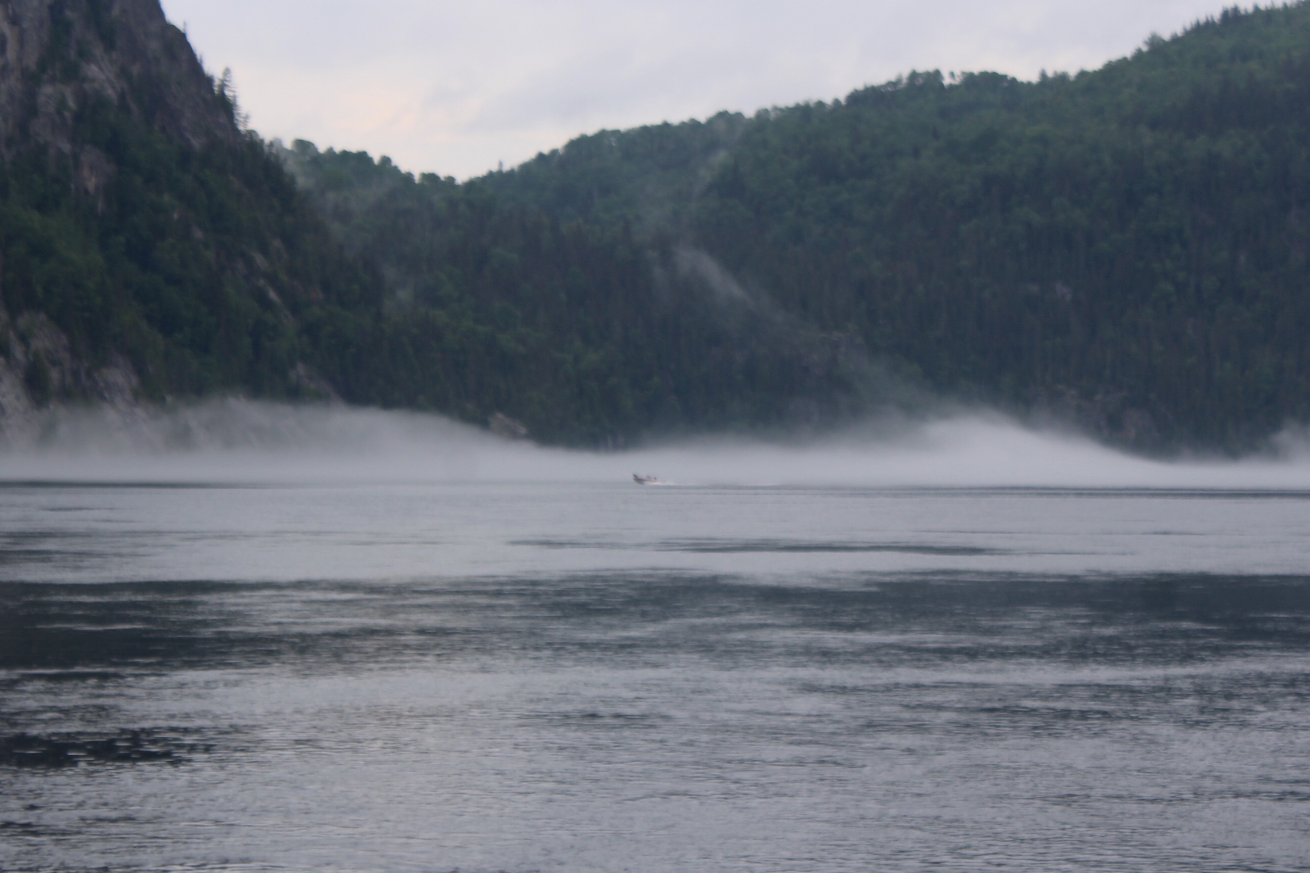 The crew arrived at the Lighthouse 45 minutes ahead of schedule. Rather than find slack current as planned, they ran head on into a 2 knot current. Once the crew entered the Saguenay River, the crew began to hear fog horns blowing. The radar showed no targets within a mile and a half but the horns sure sounded close. Amazing how sound carries over water.