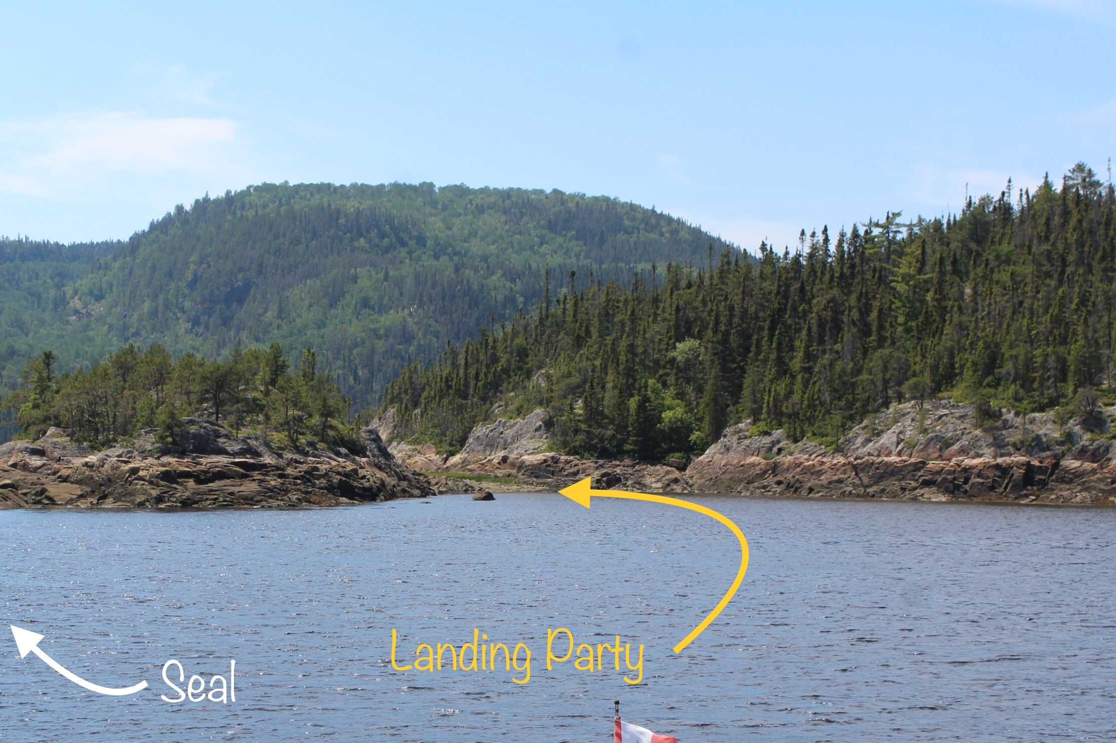 After watching the seal for a while, the skipper decided to use his stalking skills to sneak up on the unsuspecting seal. These skills would have made a French fur trader proud. The skipper dropped the dinghy, and rowed ashore out of view of the seal.