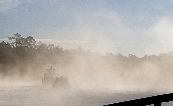 With the fog gone, the skipper thought it would be smooth sailing for the rest of the day. But that was not meant to be. As they came out into the Apalachicola Bay, they encountered a dredge dead center in the channel. The dredge told the skipper to pass on the 1, so the skipper moved to starboard to go around the dredge. He looked at the chart and noticed that there would be only 5 feet of water. Not good when your boat draft is nearly 4. The skipper slowed and eased his way around the dredge until he could get back into the marked channel.