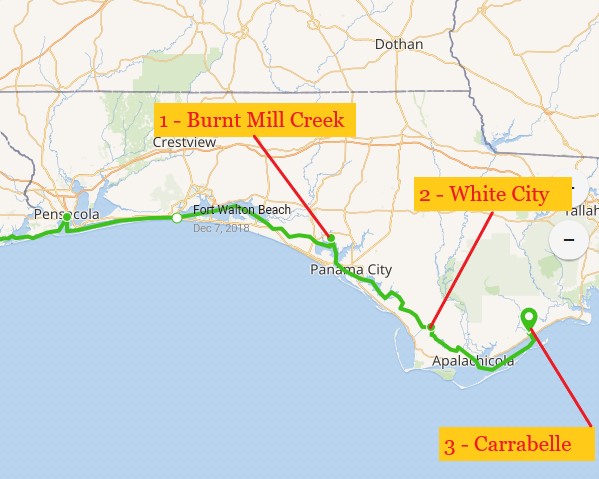 They anchored out north of Panama City on Monday in Burnt Mill Creek (1). Then stayed at a free dock in White City (2) on Tuesday. They then made way to Carrabelle (3) where they will sit and wait for a weather window to open.