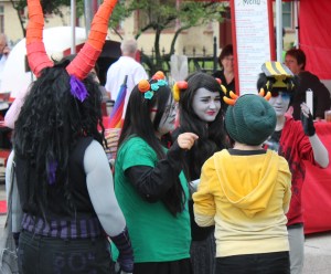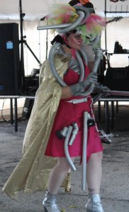 The event concluded with an alien drop. The Fire Department used a ladder truck to get above the landing location for the Sputnik Space Debris. Then they dropped some five hundred alien erasers with numbers on them onto the street. People had purchased raffle tickets with the numbers throughout the day. The alien closest to the ring mark in the road won its owner one thousand dollars.