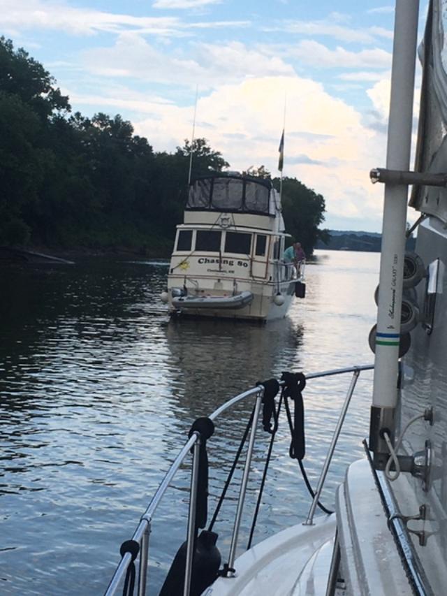 The next obstacle was to find the marked channel over the dam at Lock 52. A down bound tow captain told the skipper that the reds were under water because of the flooding. The tow captain said he only saw one of the green buoys. The skipper asked the tow Captain about the sailing line and how it lined up with the marked channel for the dam. The tow Captain responded that they were not the same but the sailing line would allow safe passage over the dam. With that info in hand, the skipper just stayed on the sailing line on the chart plotter and cruised over the dam. He only saw one green buoy as he navigated the channel.
