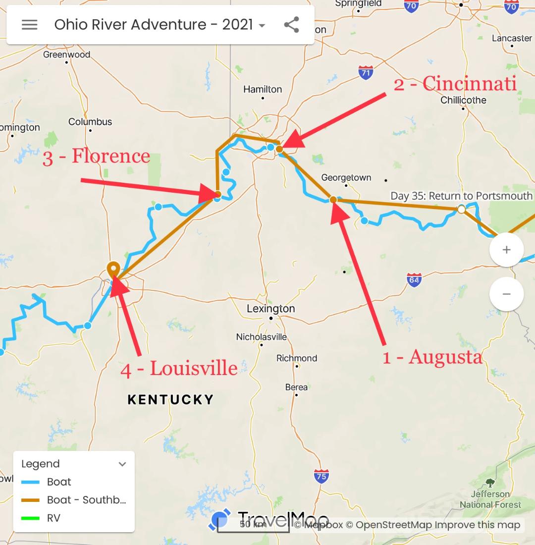 Well it has been both a fun and challenging week as the crew made way from 2 Rivers Marina to Paducah. This is hands down the most difficult section of the Loop, and it lived up to its reputation. The crew made the following stops along the way: