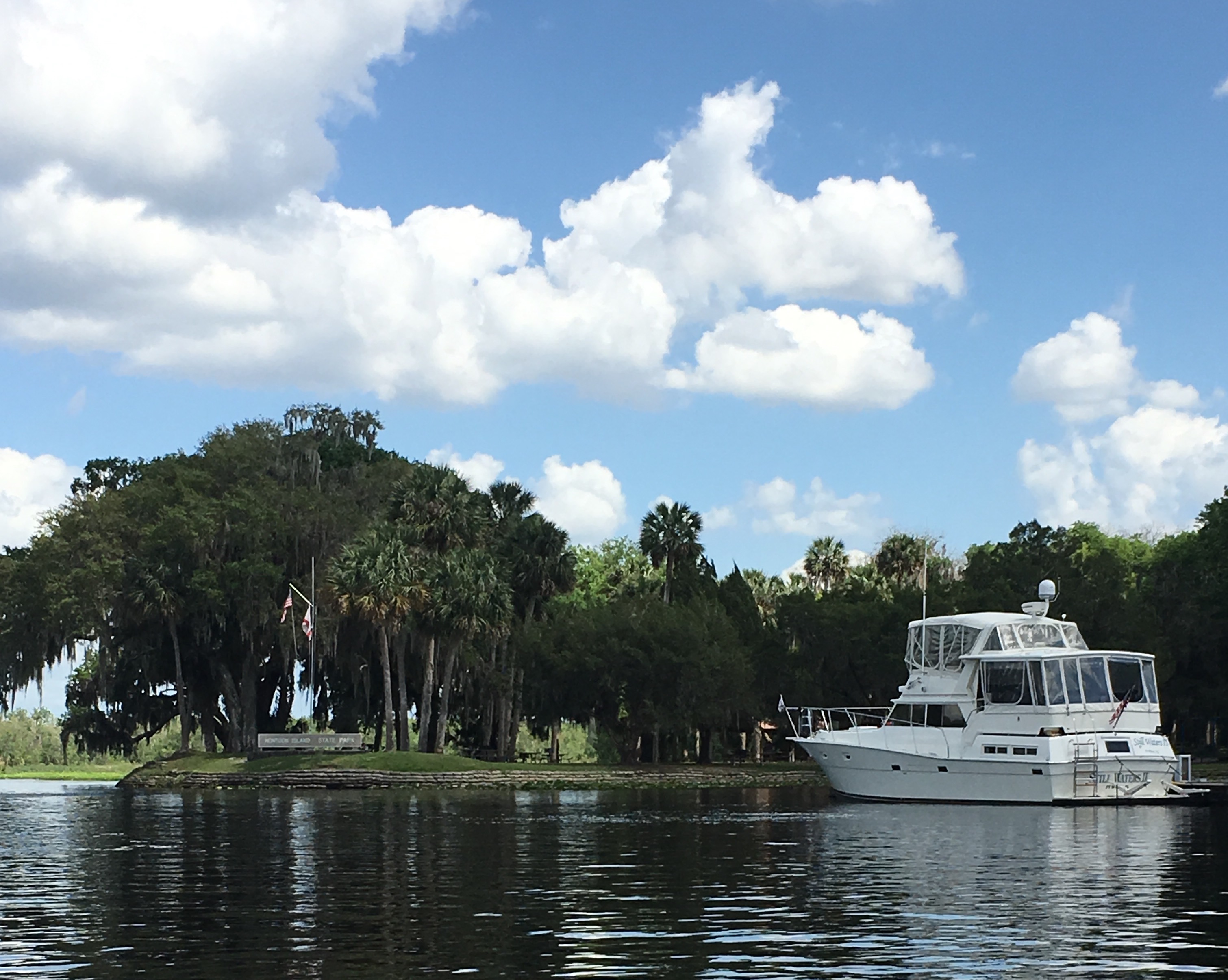 On Thursday, the crew got an early start by pulling anchor at 0700 for the run back to Ortega Landing. After passing north of Palatka, the river widens up and become very wide. The skipper decided to run a test to see how the dinghy would ride at different speeds. The wind was blowing about 15 mph and causing 2 foot waves. The skipper began raising the rpms on the engines and watching how the dinghy was riding on the swim platform. After reaching 15 knots, the boat was gliding over the water smoothly and there were no issues with the dinghy.